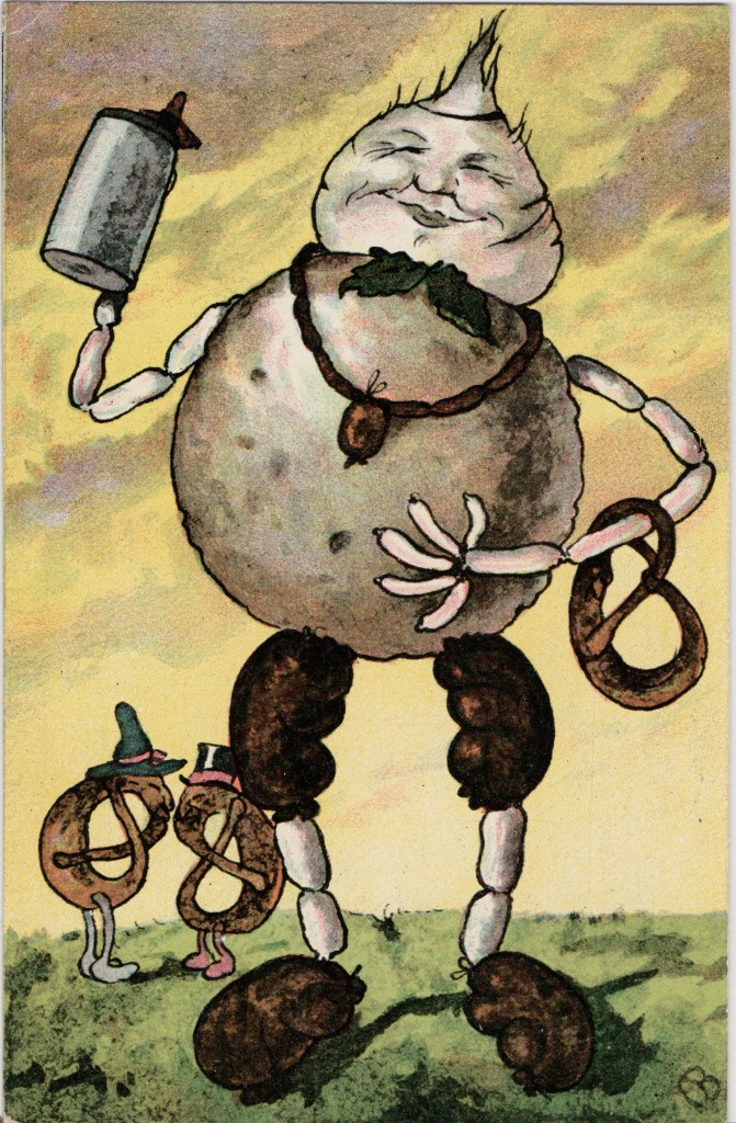 After starting to collect early 20th century Swiss and German anthropomorphic vegetable postcards (see here), I naturally started to collect cards featuring anthropomorphic radishes. But these are narratively distinct: rather than displaying radish lifestyles, they mostly associate radishes with beer, and often Munich, and involve interactions with humans. At first I thought the vegetables were perhaps turnips or rutabagas, but the first card below refers a “Radi.” According to this site, “‘Radi’ is the Bavarian name for ‘Rettich’, which is the german word for a Daikon radish.” And, as this site explains, Radi is also the name of a snack traditionally served with beer, “a spiral-cut radish that is sprinkled with salt and maybe chives.” Radishes are also common on German beer steins, and this site explains that “All stein collectors are familiar with the picture of a child, dressed in a cowl, with radishes in one hand, a filled beer stein in the other, smiling devilishly from a stein decoration.” Thus, the cards below seem to be a celebration of the traditional connection between radishes and beer, particularly in Munich.