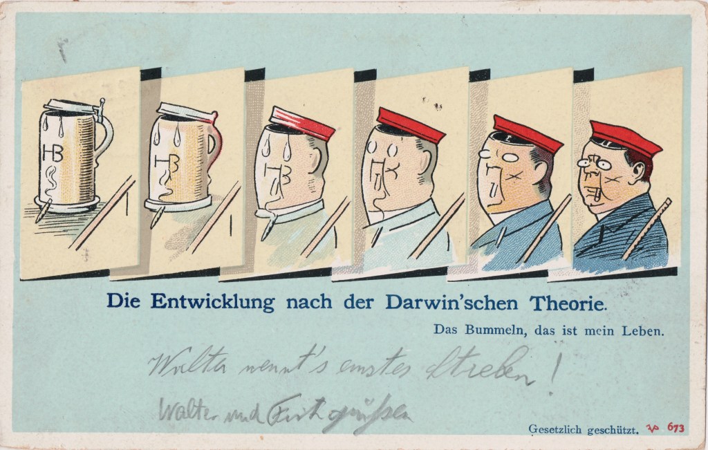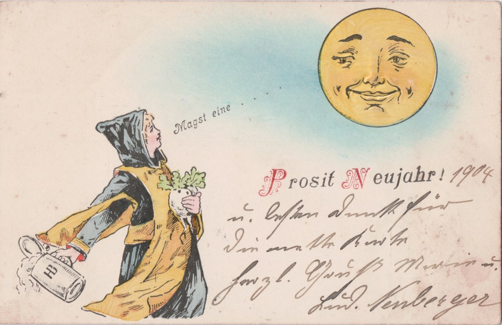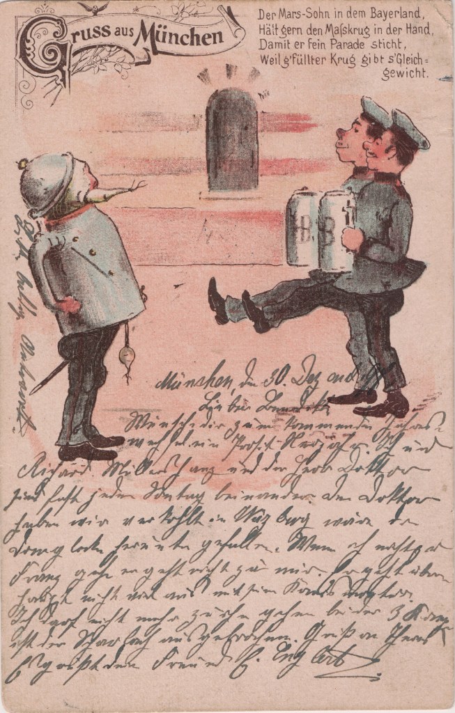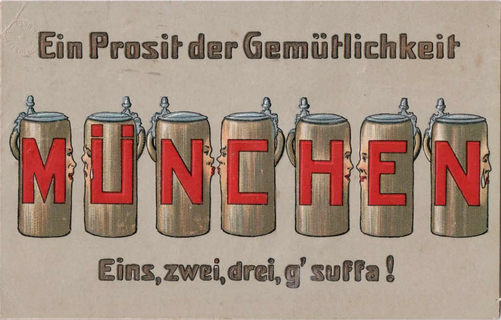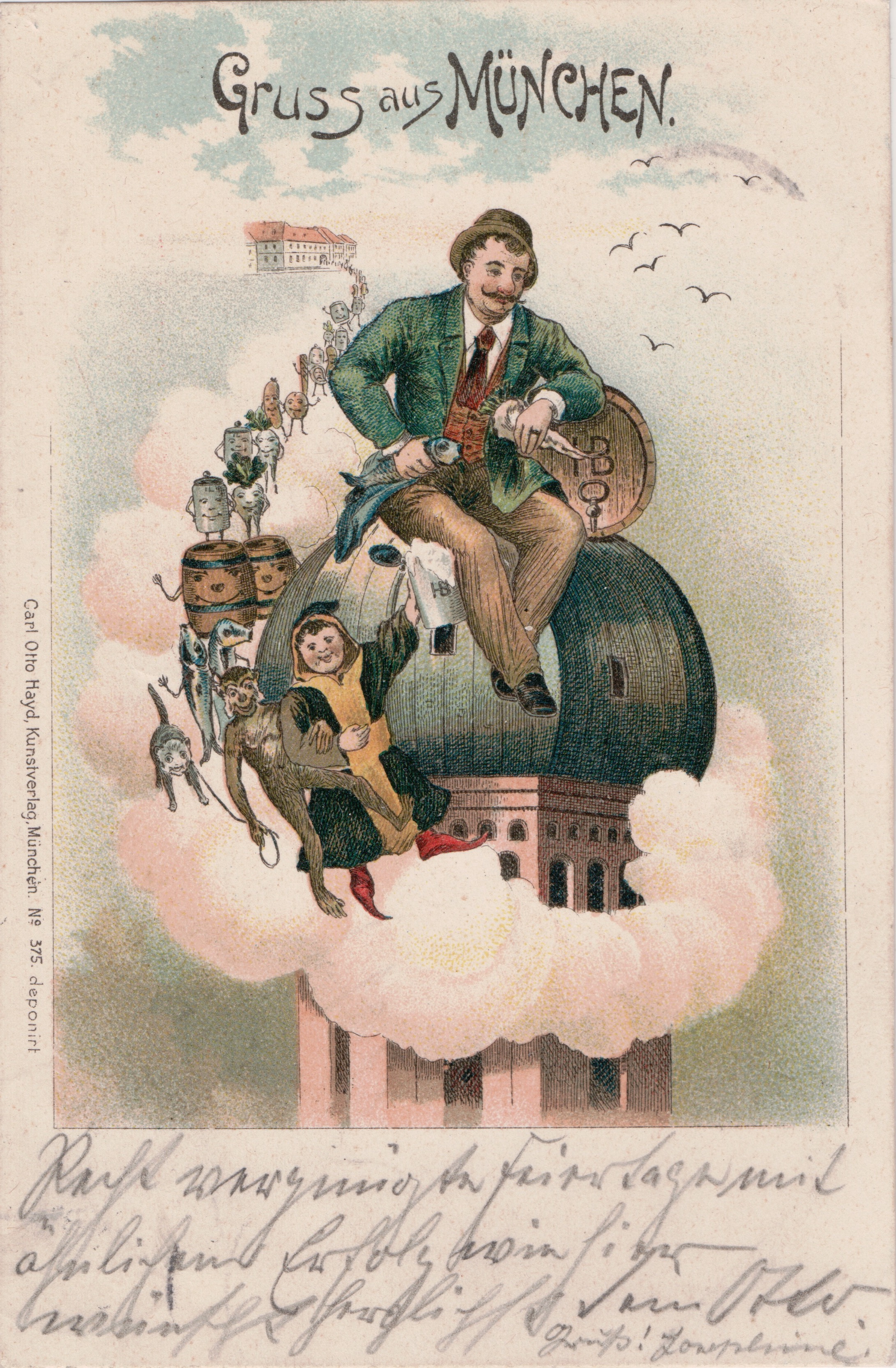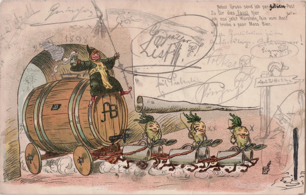 And, finally, here are some other beer-themed postcards, many featuring anthropomorphic steins. You just have to imagine the radishes just out of sight (or in a pocket, or for feet…). The first six all say “Greetings from Munich!”