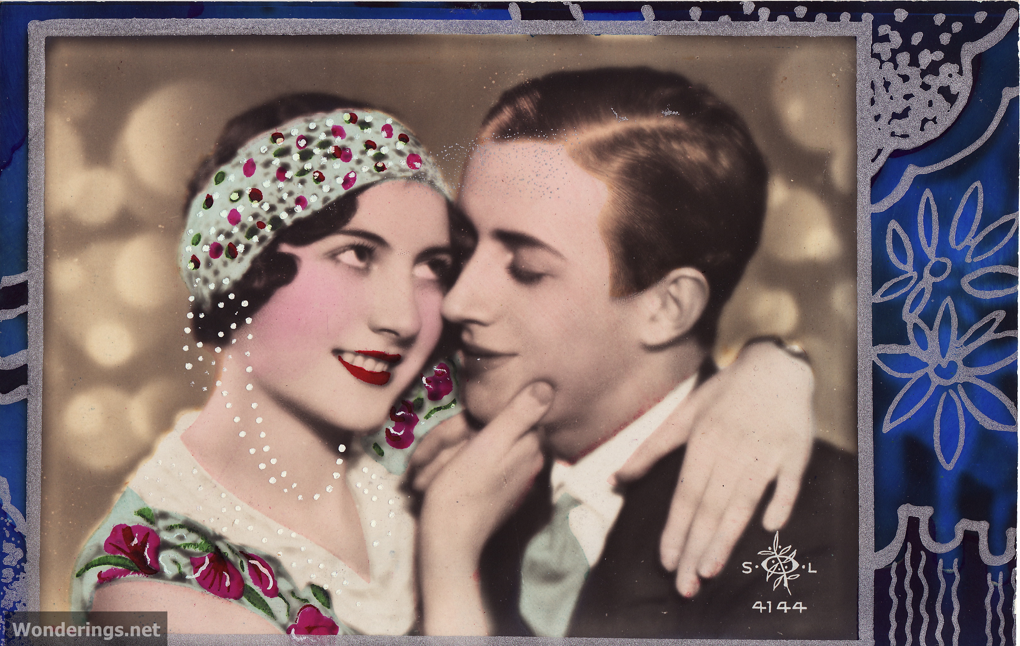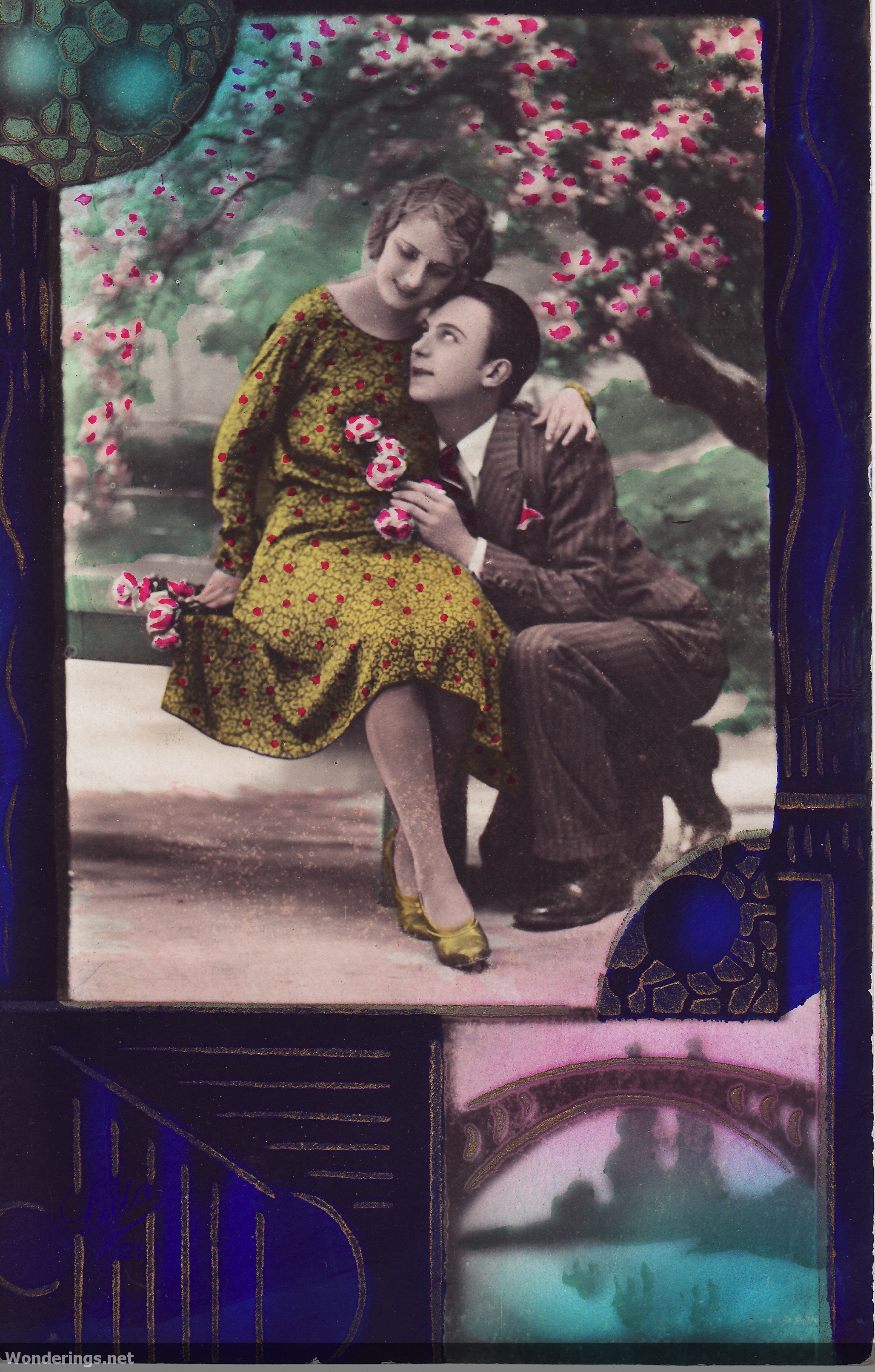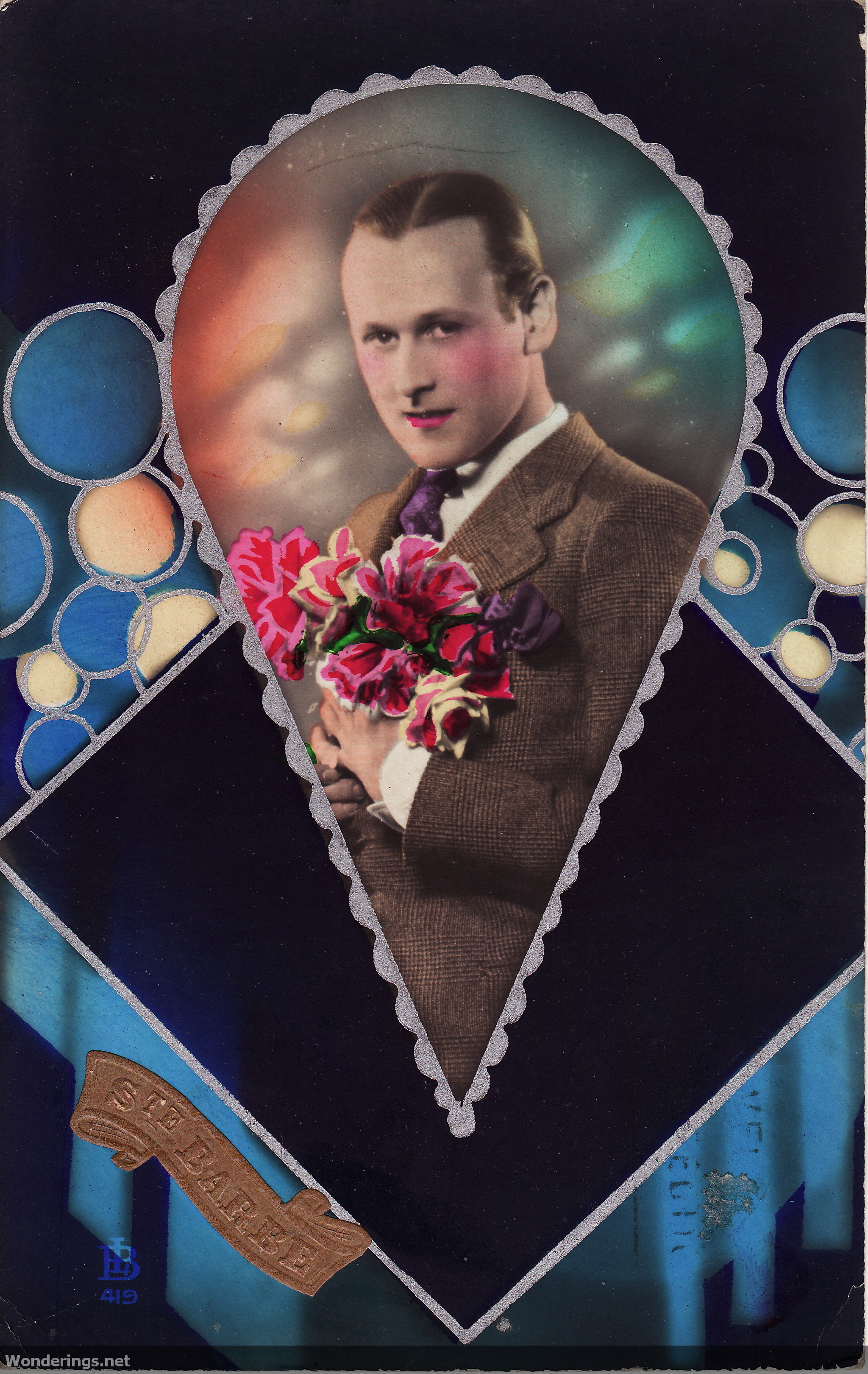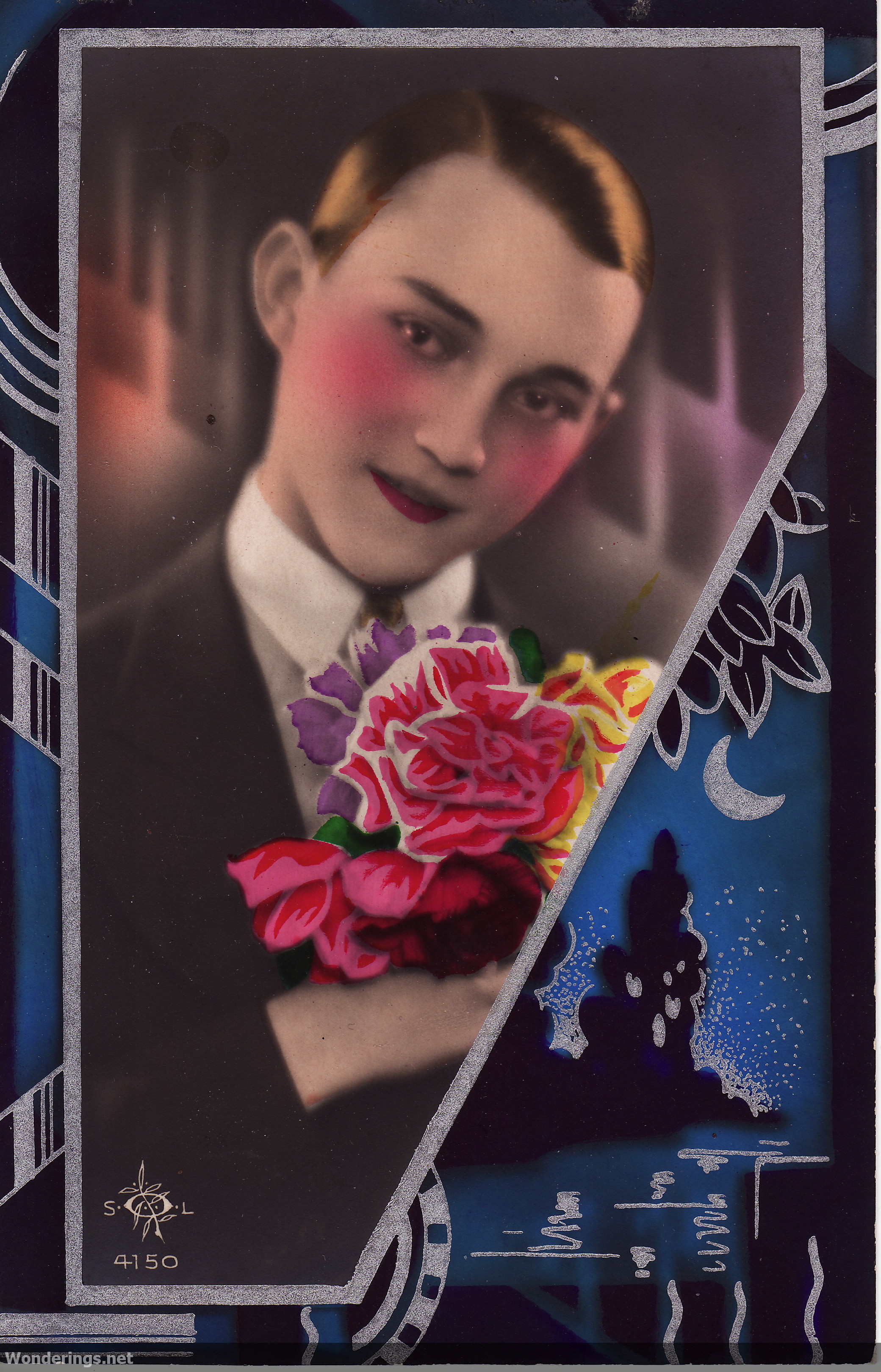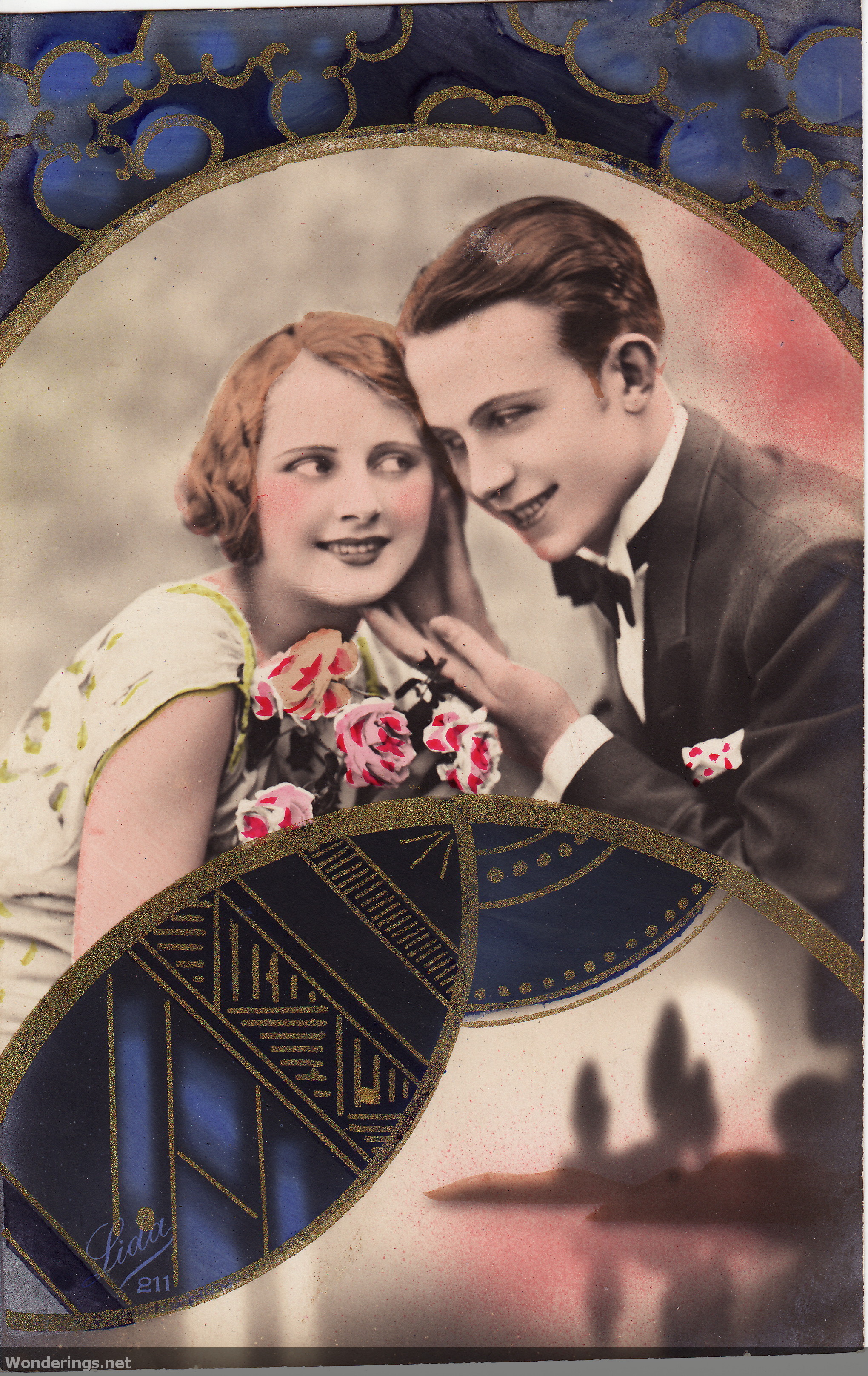 A number of different studios — including Bergeret, P.C., SOL, and Lida — produced art deco cards characterized by blue framing with designs and gauzy imagery.  The two cards that I have that bear dates are both from 1932. Click on any of the images to scroll through all of the images in each set.