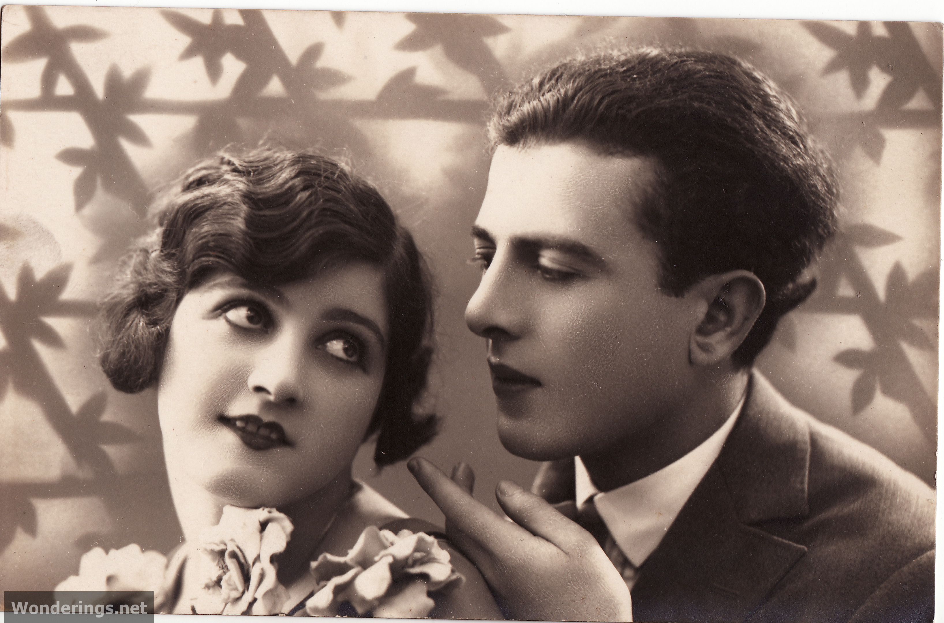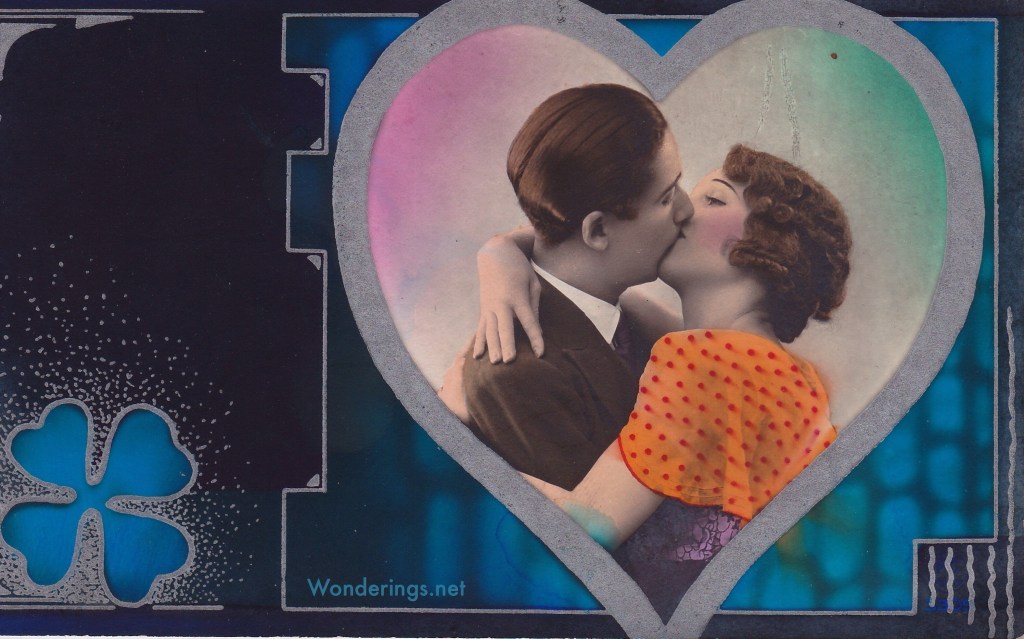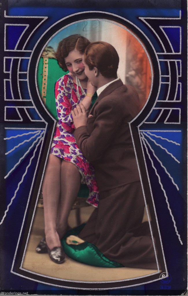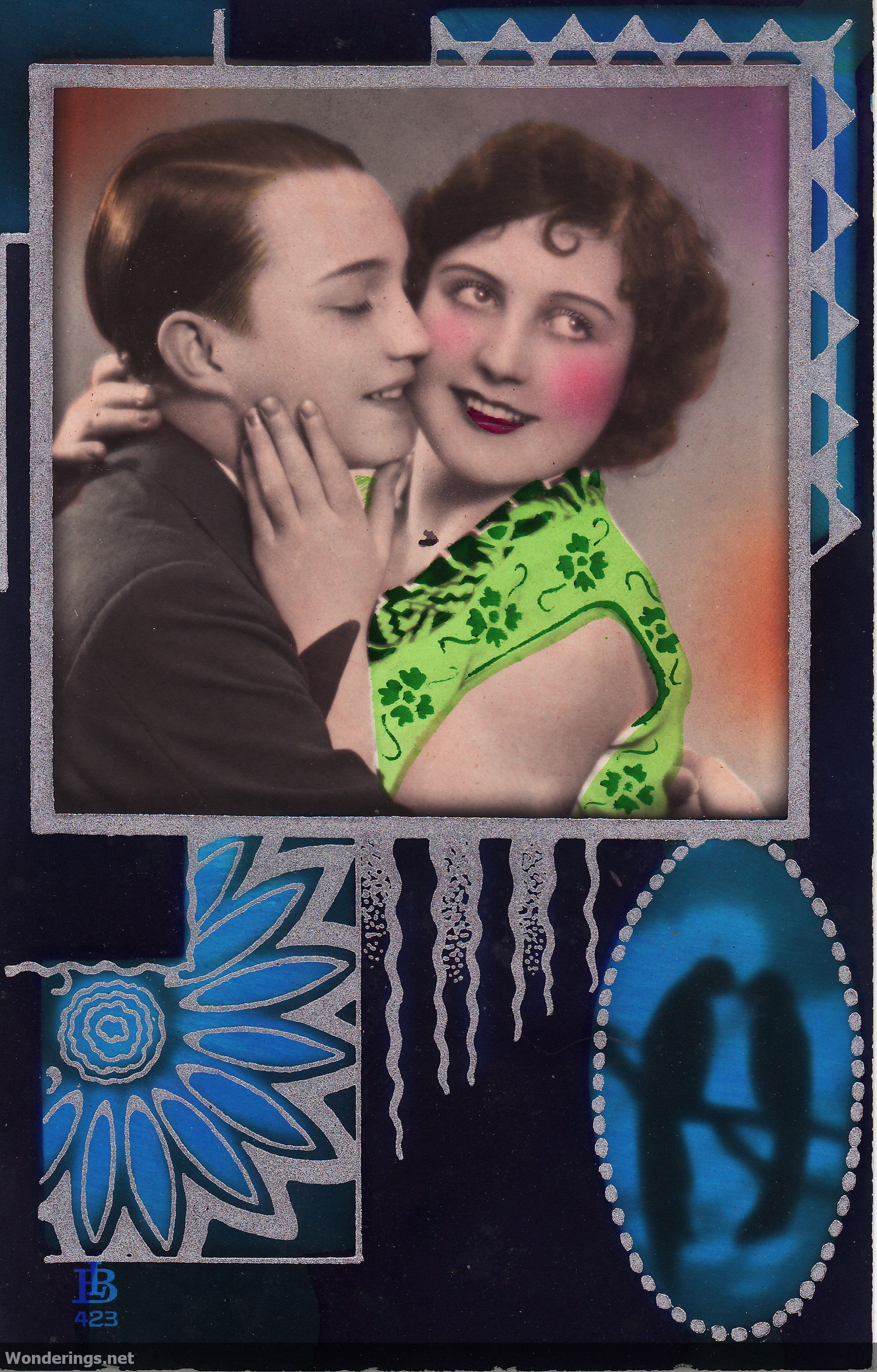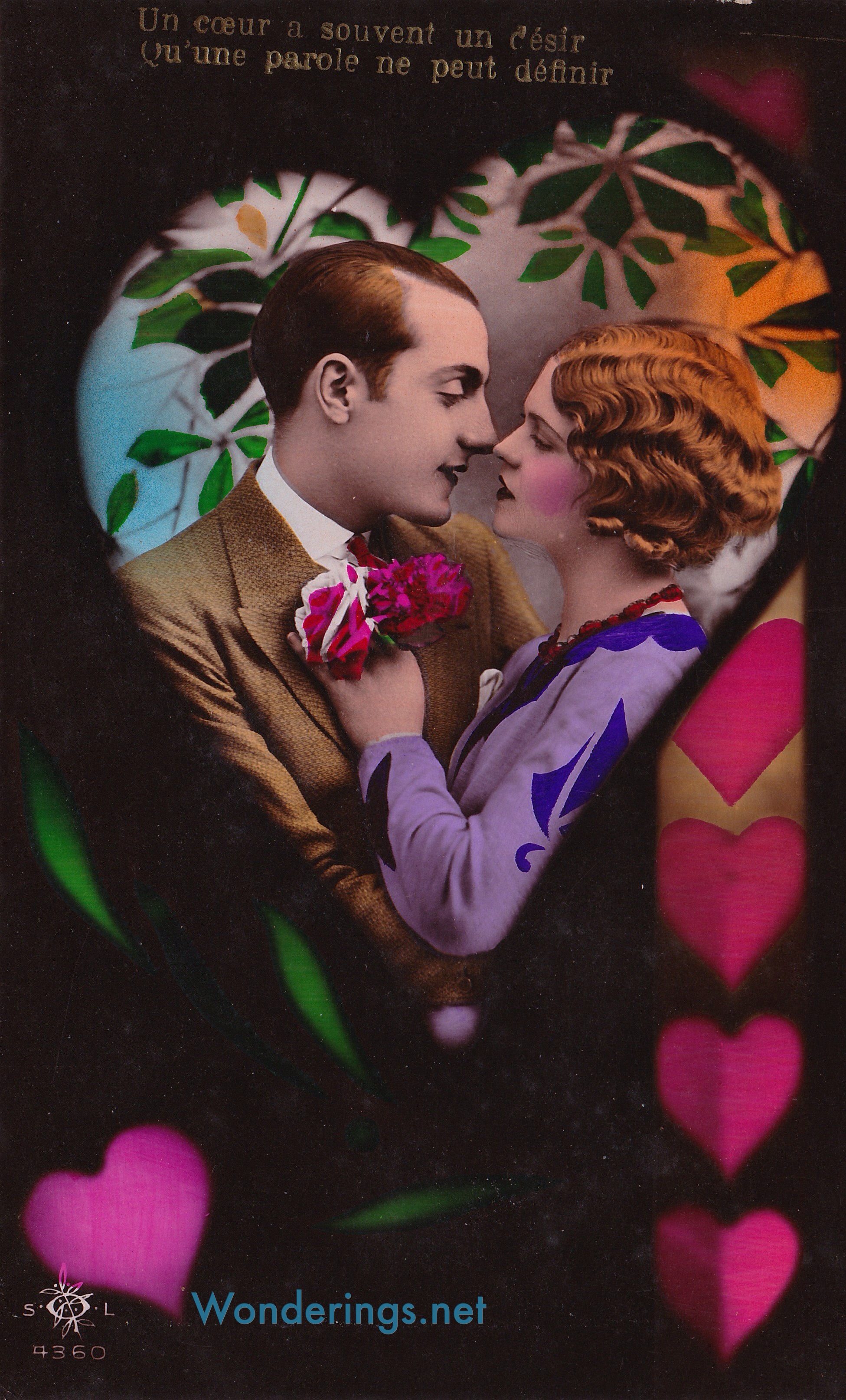 A number of different studios — including Bergeret, P.C., SOL, and Lida — produced art deco cards characterized by blue framing with designs and gauzy imagery.  The two cards that I have that bear dates are both from 1932. Click on any of the images to scroll through all of the images in each set.