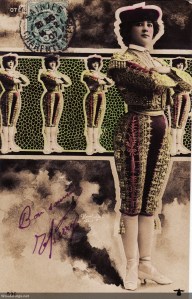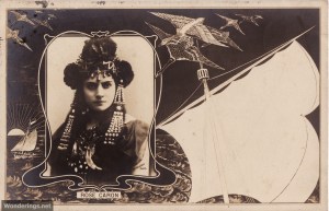 Interestin. I too have a good number of antique hand tinted postcards of Atelier Reutlinger – most unused, undivided backs of different series from the 1900-1904 period showing famous stage personalities of the time among which Otero; Liane De Vries; Gilda Darty; Stratzaers; Blanche Miroir; Cleo de Merode; Frascuelita; Liz Chavita; Nina D’Asty; and Liane de Pougy and Zarina (in art noveau frames); De Freville and Colonna Romano (Casino de Paris seies), Nimidof; Catherine Mastio (Opera series). I wonder if any of your readers have any information on other postcard printers of the same era (of which I also have many cards) – eg: H. Manuel (Paris) , Anthony’s Paris; Walery (Paris); BNK (?Paris); NRM; NPG and Alterocca Terni (Italy); RPH (? Germany) and Raphael Tuck et Fils Paris (Real Photo series; Beauty Series; Musical Celebrities Series with various cards showing ladies in elegant attire with attched designs like paste bead highlights added to wraps, dresses and headscarfs).