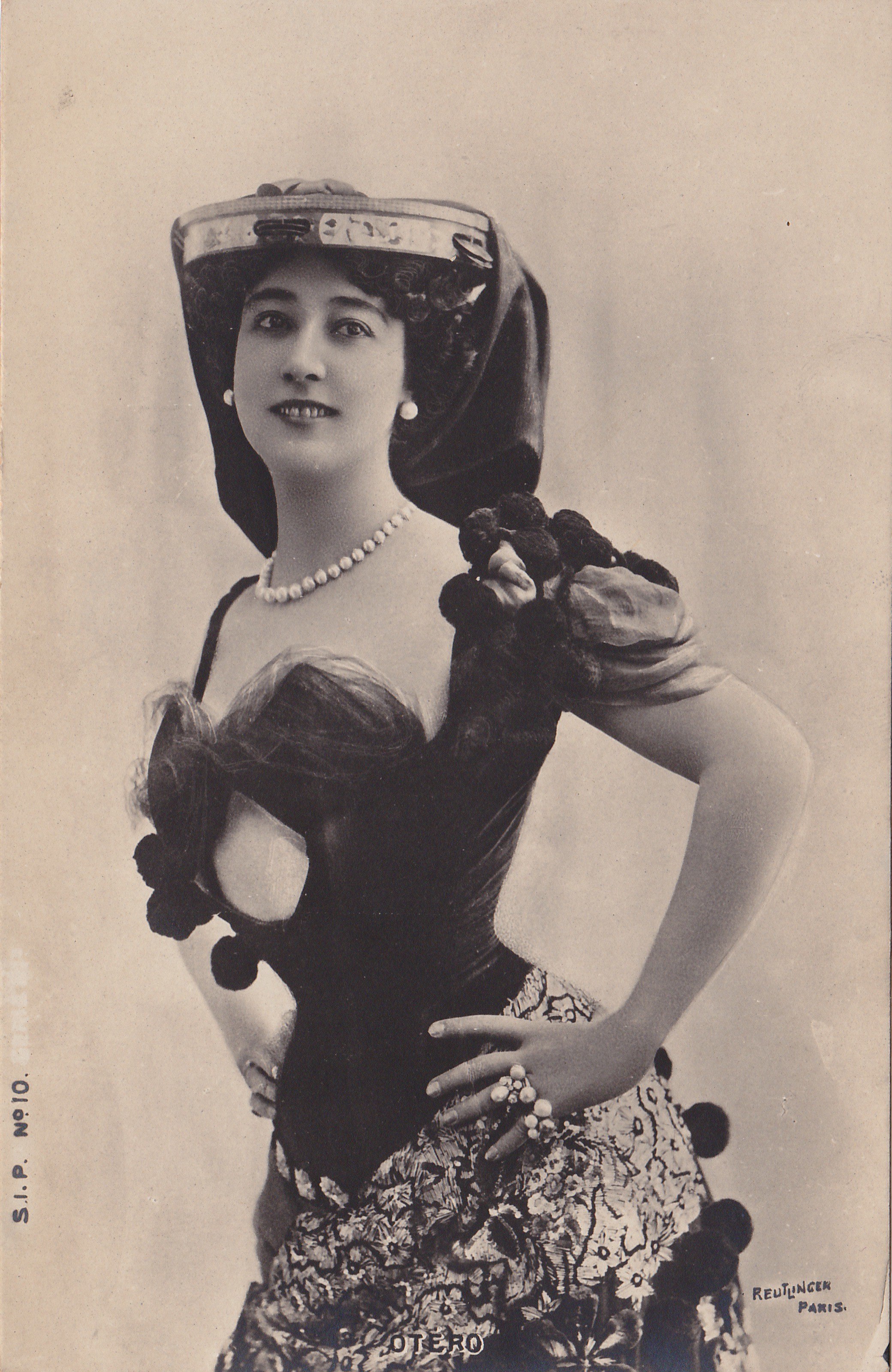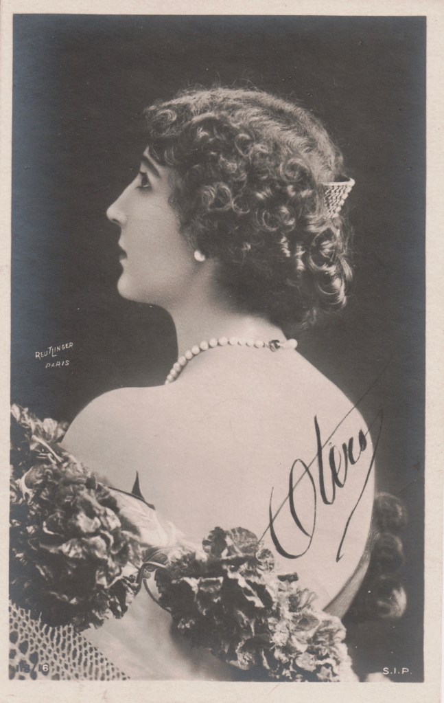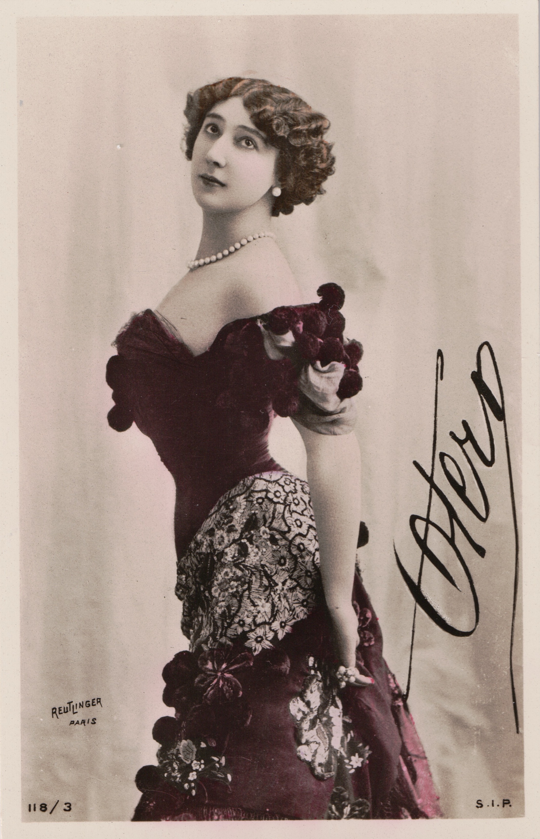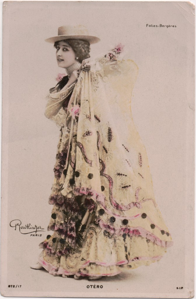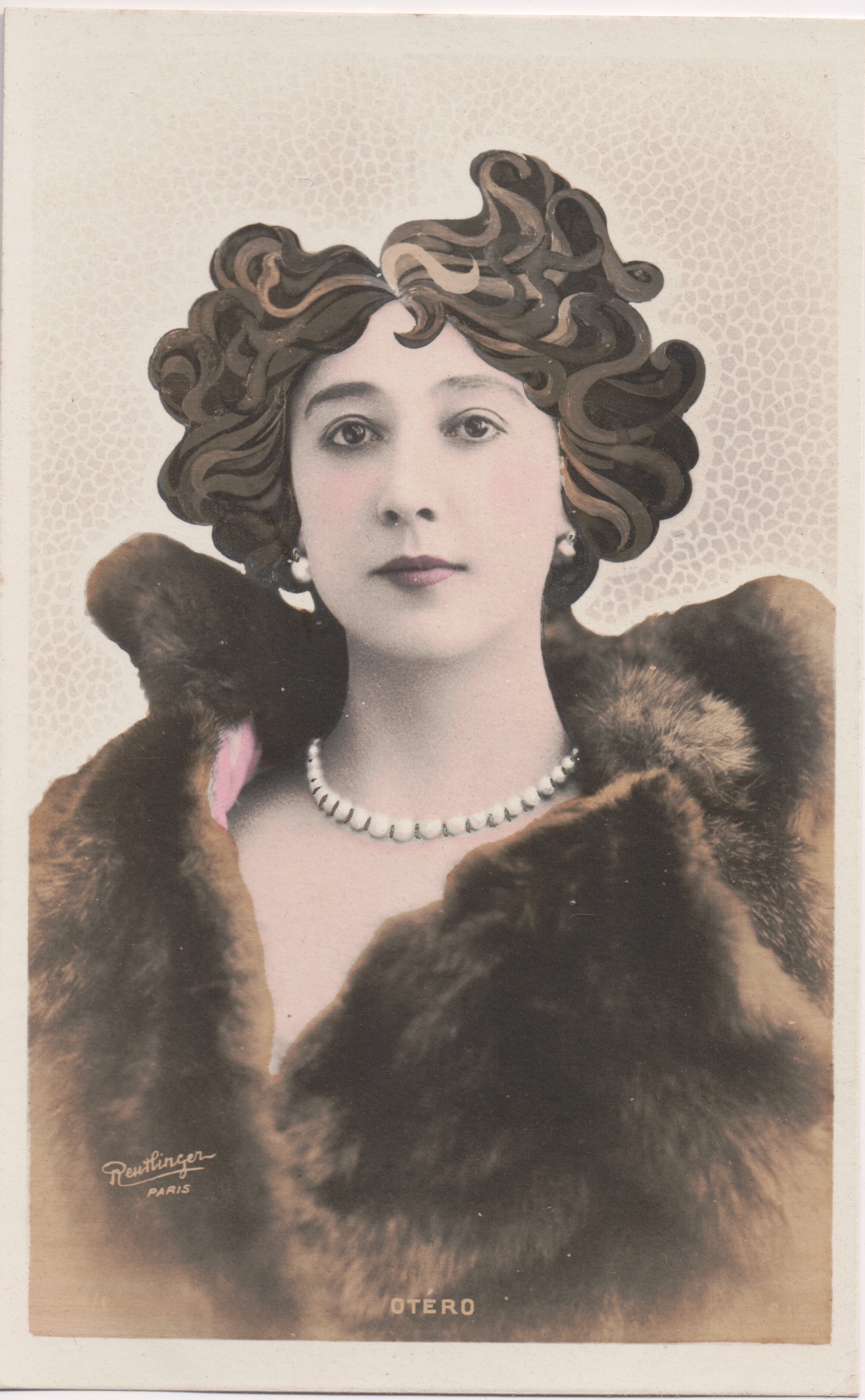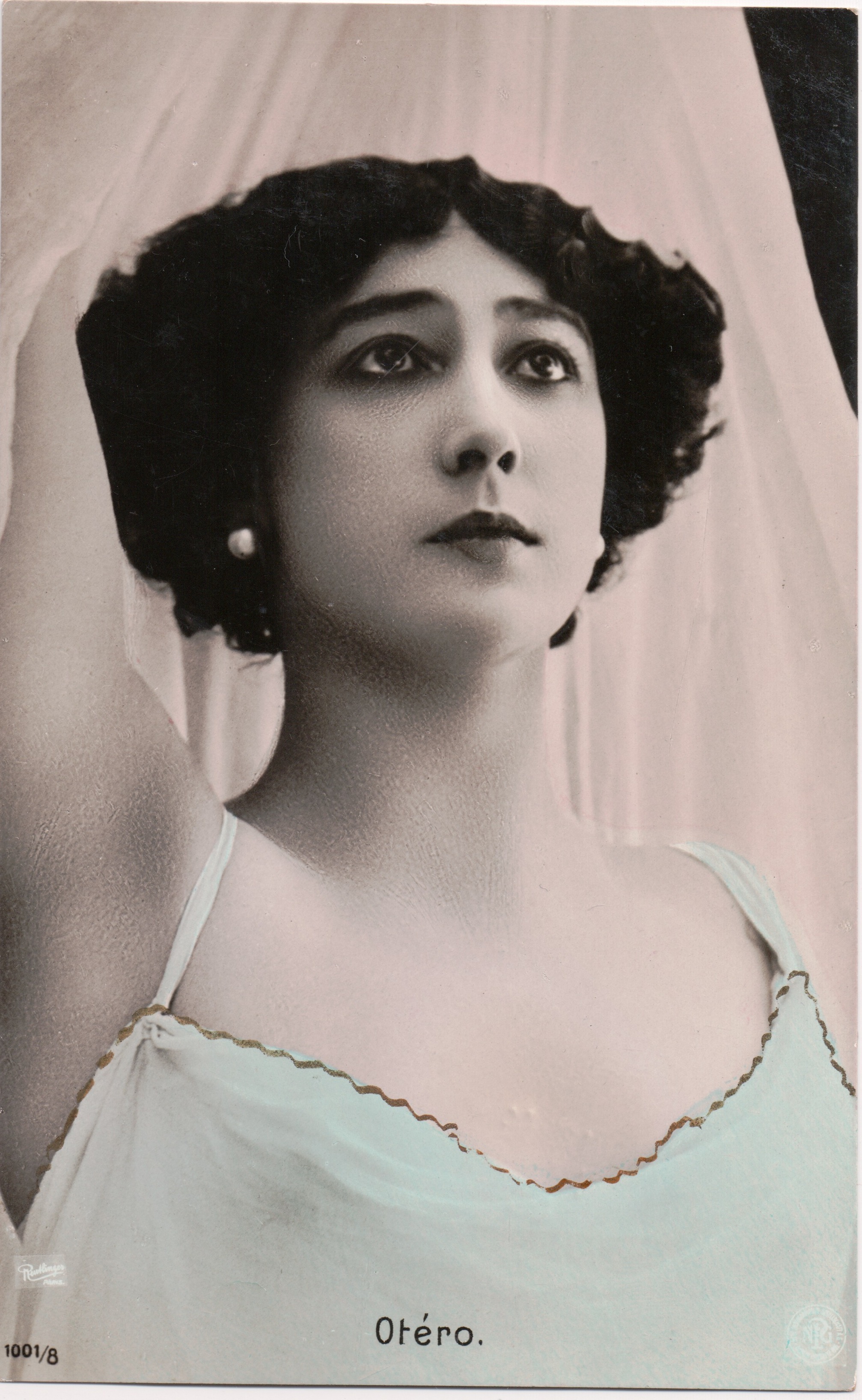 Cléo de Mérode, born in Paris, who was a famous ballet dancer, who also went on to dance at the the Folies Bergère. She has been called “the first modern icon.” Her wikipedia page and this Red List page has more information and images, but the definitive source for information about her life and significance is Carval’s book, referenced above. Here is an impressive online journal piece called “Cléo de Mérode’s Postcard Stardom.” This link appears to have film footage of her dancing (as well as Caroline Otero — see below).