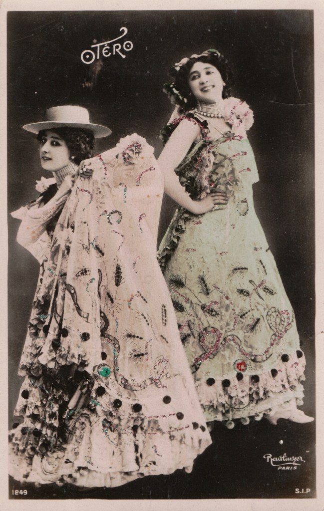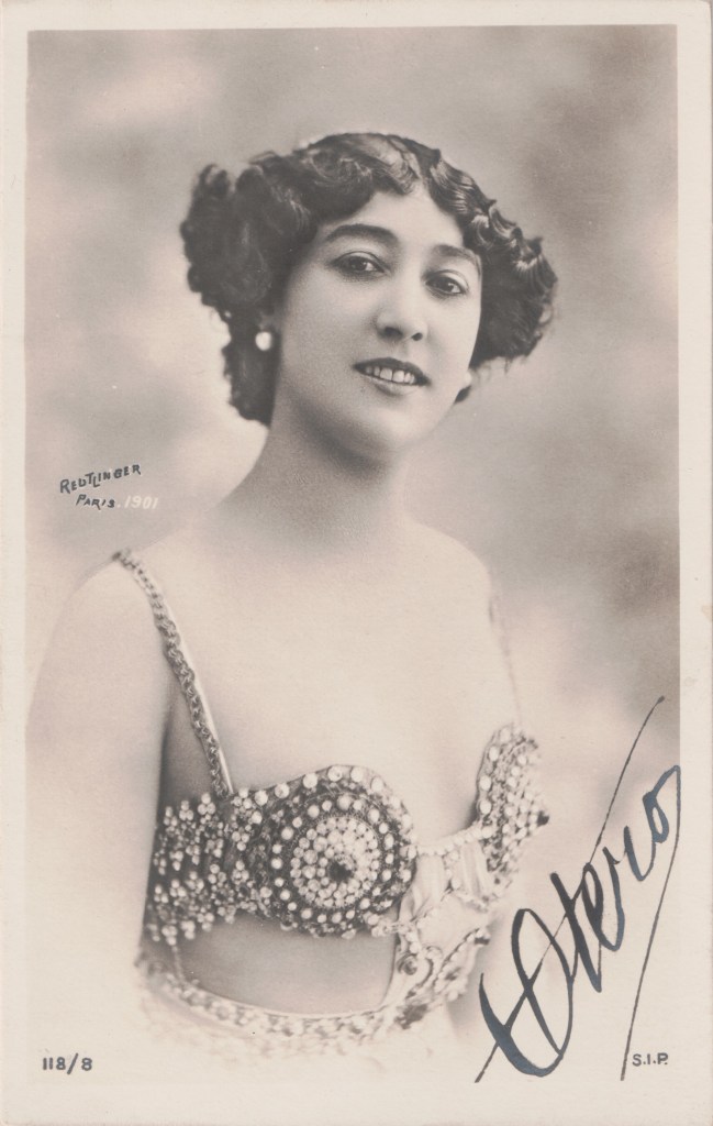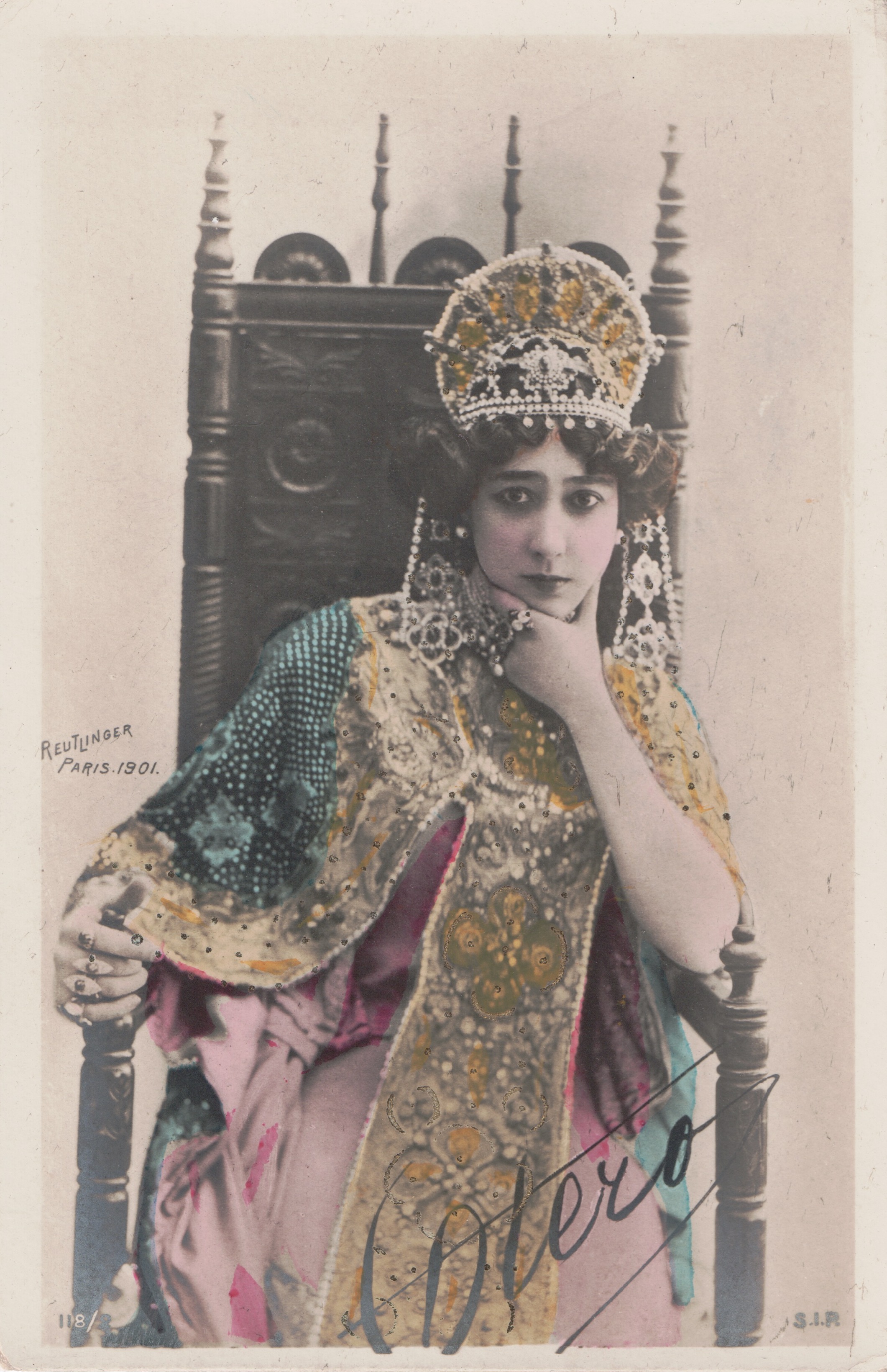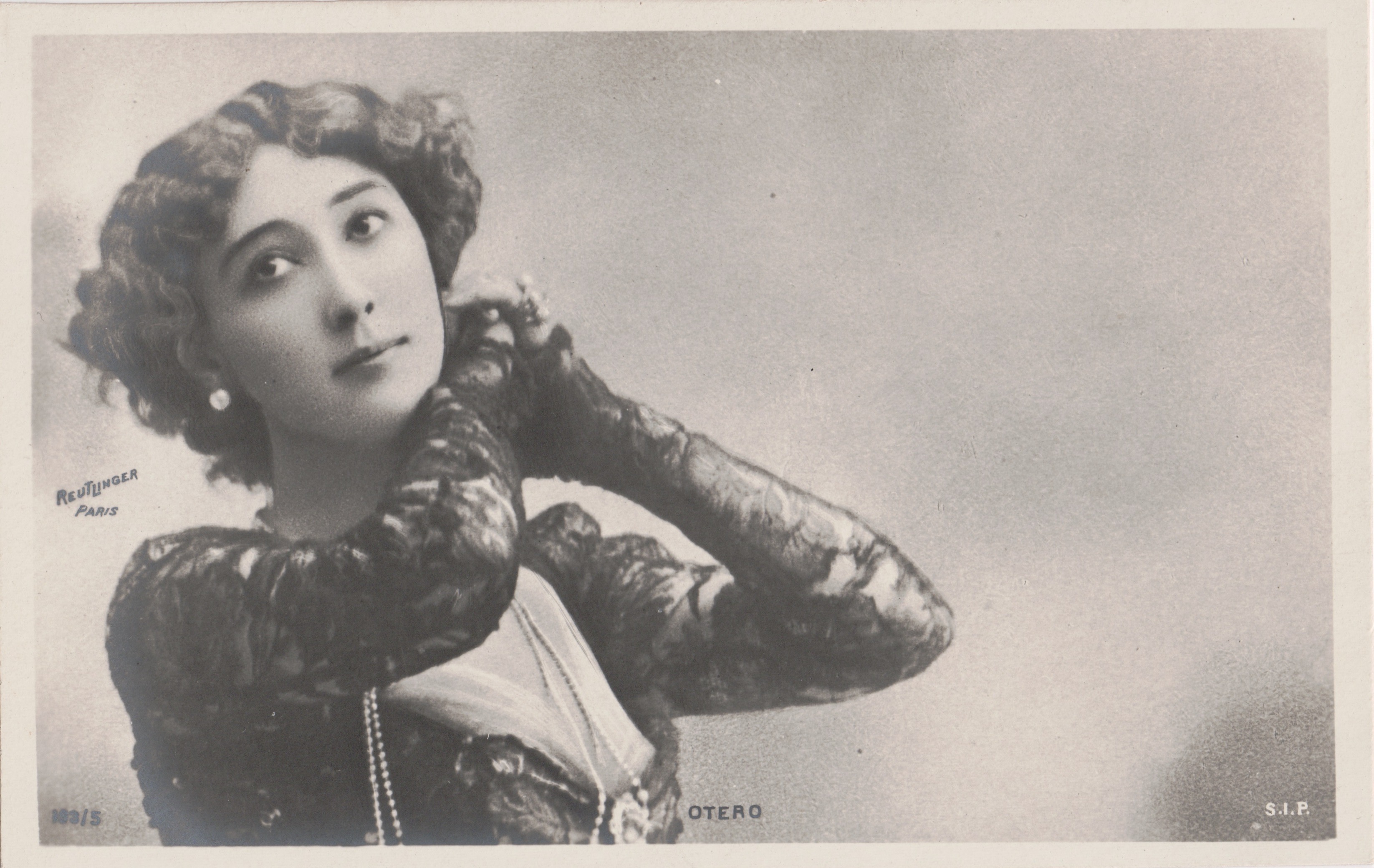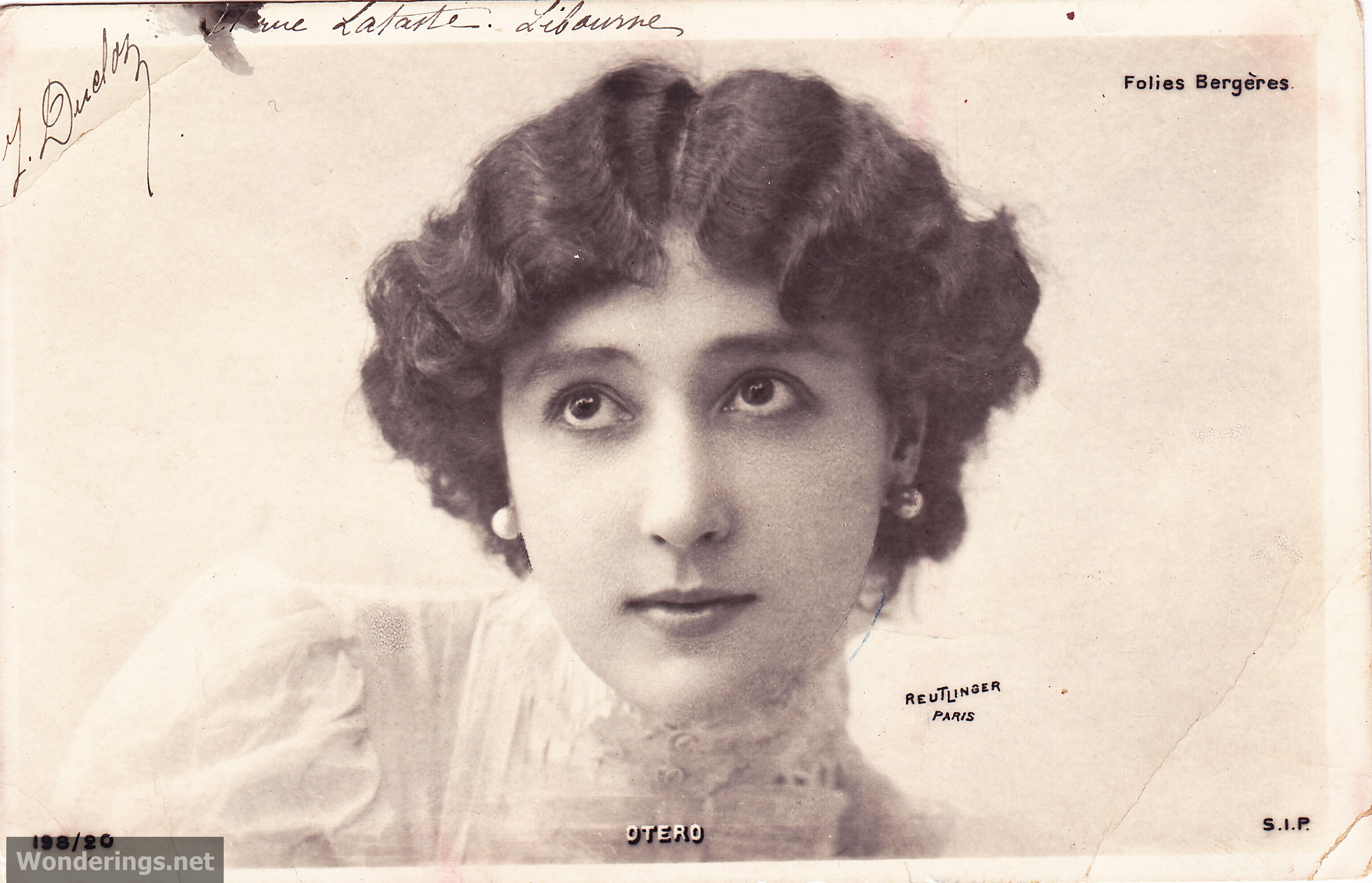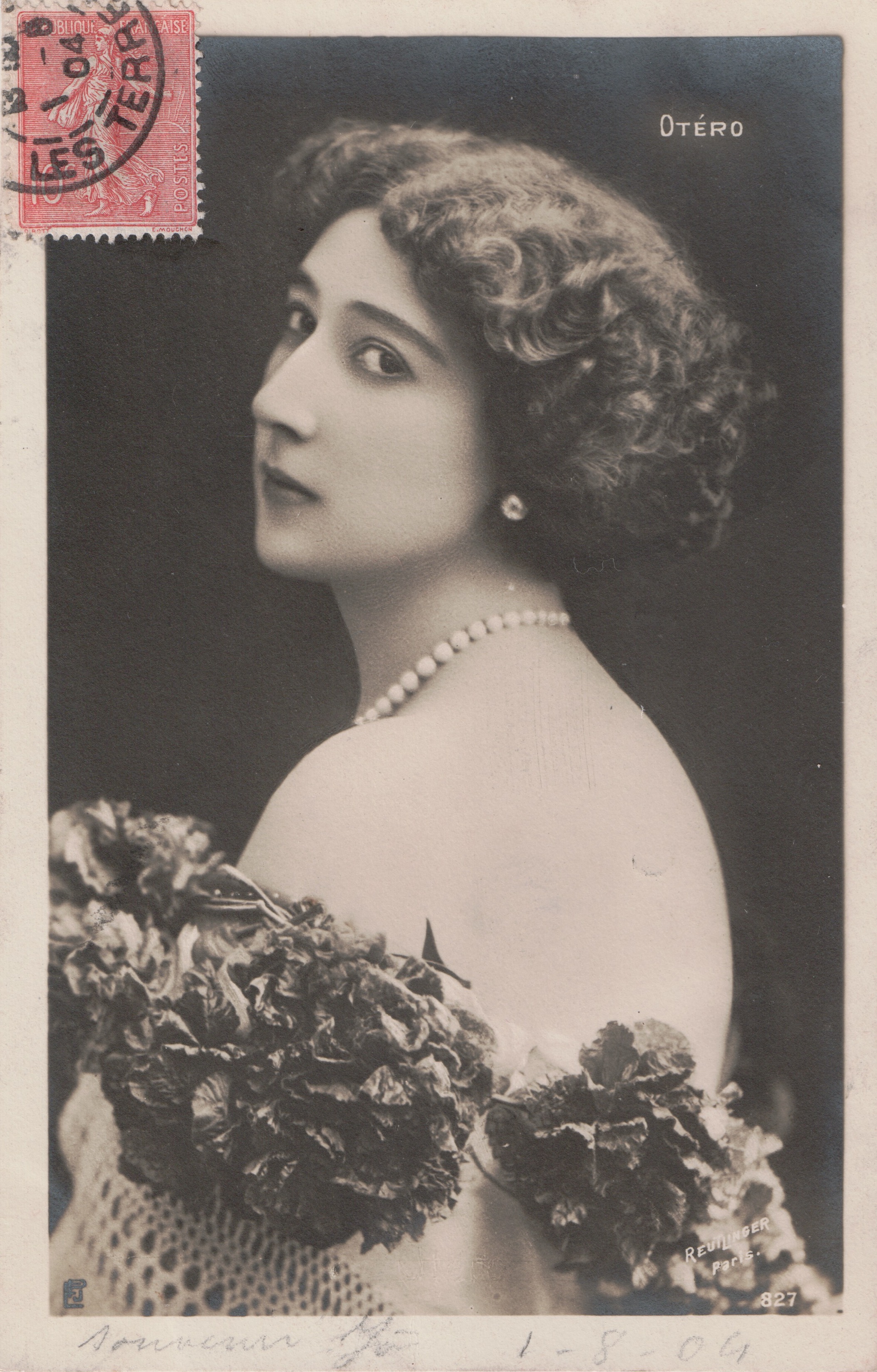 Cléo de Mérode, born in Paris, who was a famous ballet dancer, who also went on to dance at the the Folies Bergère. She has been called “the first modern icon.” Her wikipedia page and this Red List page has more information and images, but the definitive source for information about her life and significance is Carval’s book, referenced above. Here is an impressive online journal piece called “Cléo de Mérode’s Postcard Stardom.” This link appears to have film footage of her dancing (as well as Caroline Otero — see below).