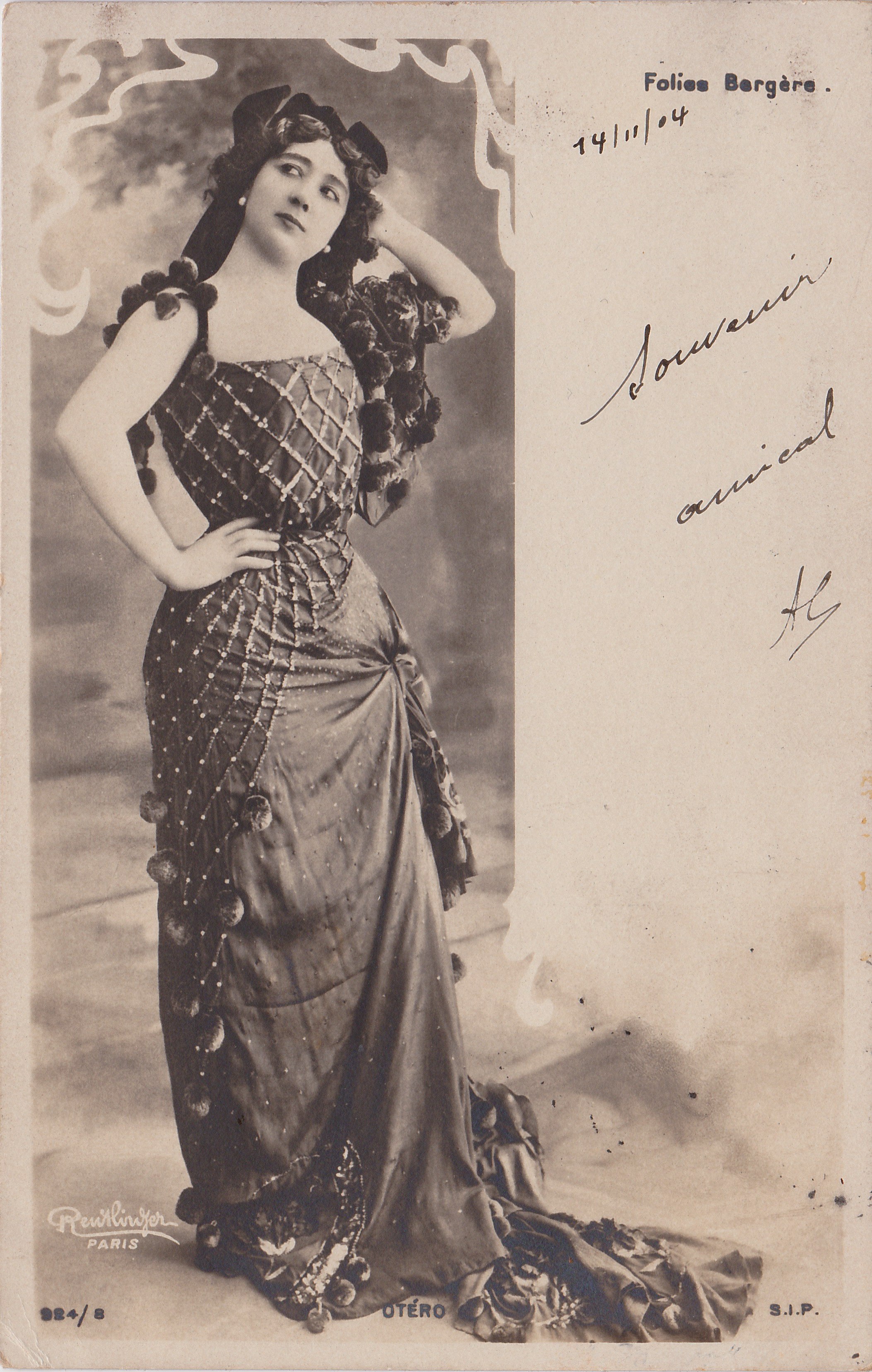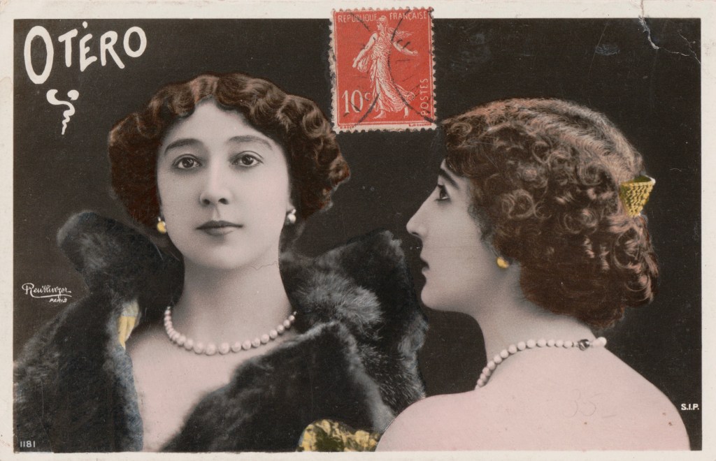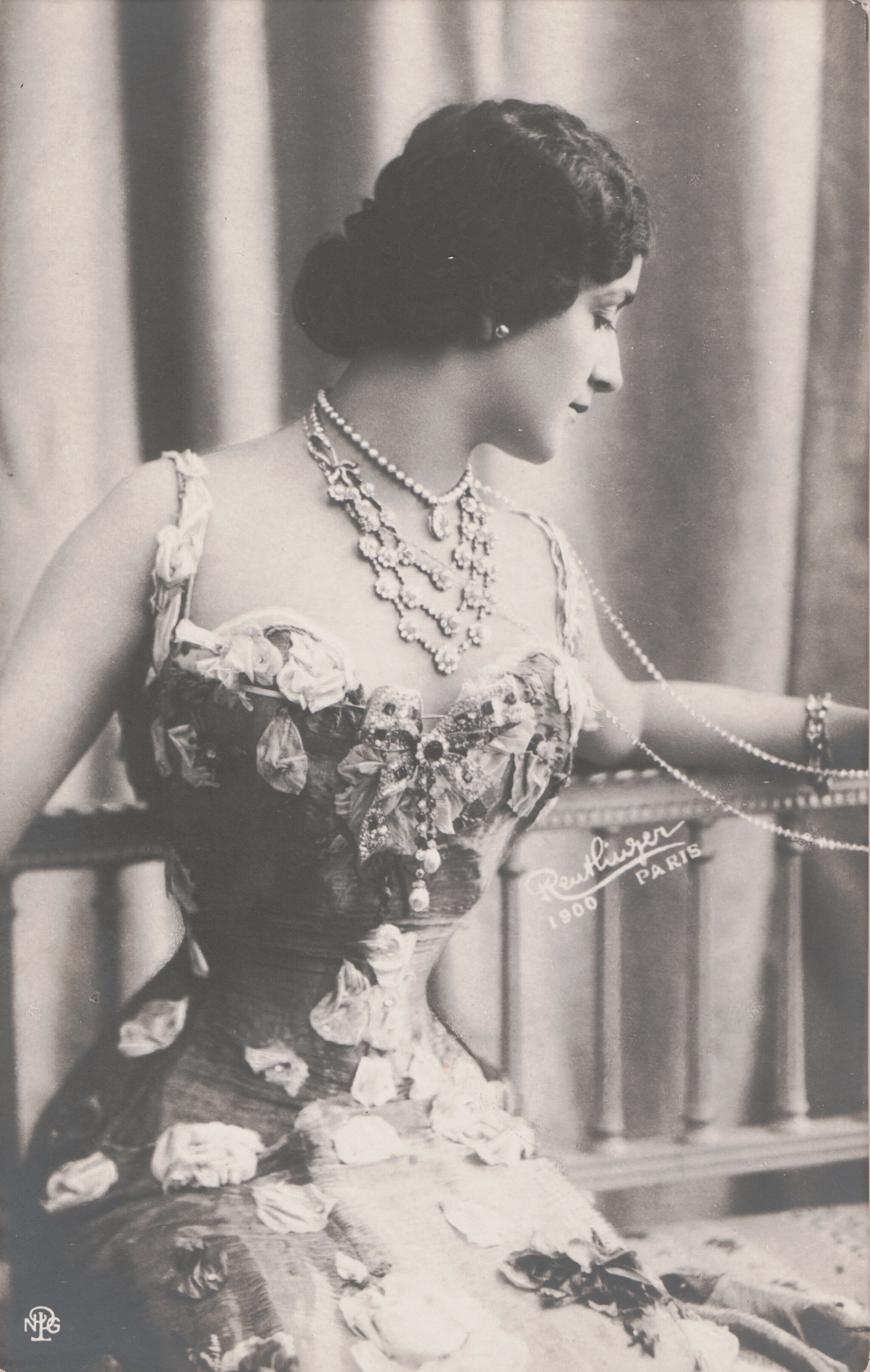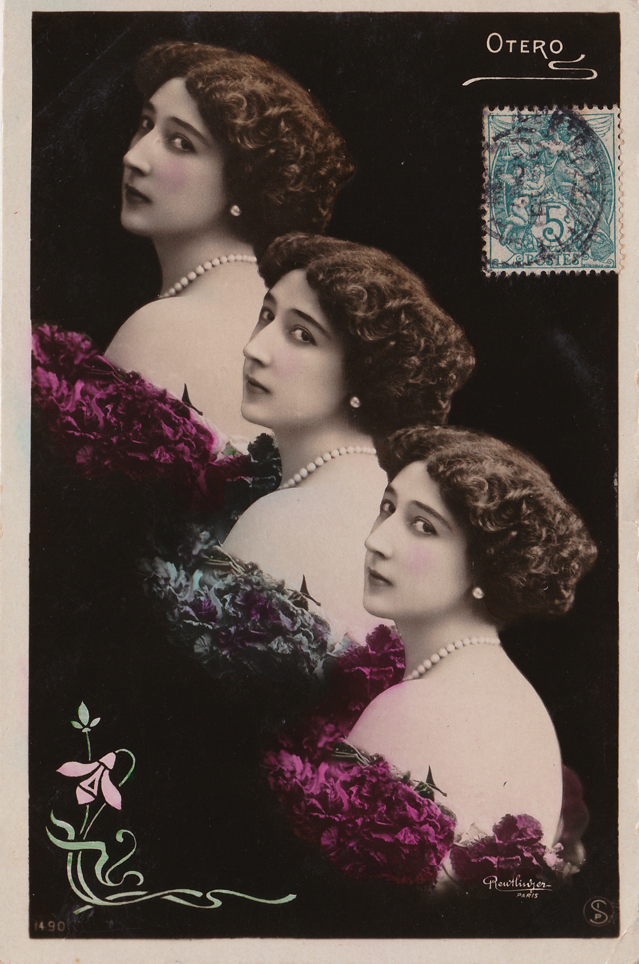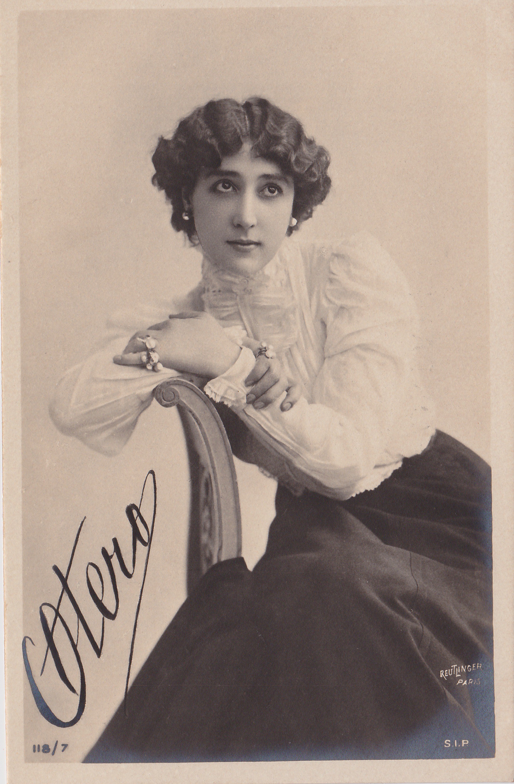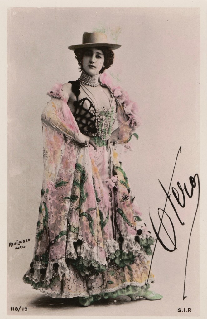 Cléo de Mérode, born in Paris, who was a famous ballet dancer, who also went on to dance at the the Folies Bergère. She has been called “the first modern icon.” Her wikipedia page and this Red List page has more information and images, but the definitive source for information about her life and significance is Carval’s book, referenced above. Here is an impressive online journal piece called “Cléo de Mérode’s Postcard Stardom.” This link appears to have film footage of her dancing (as well as Caroline Otero — see below).