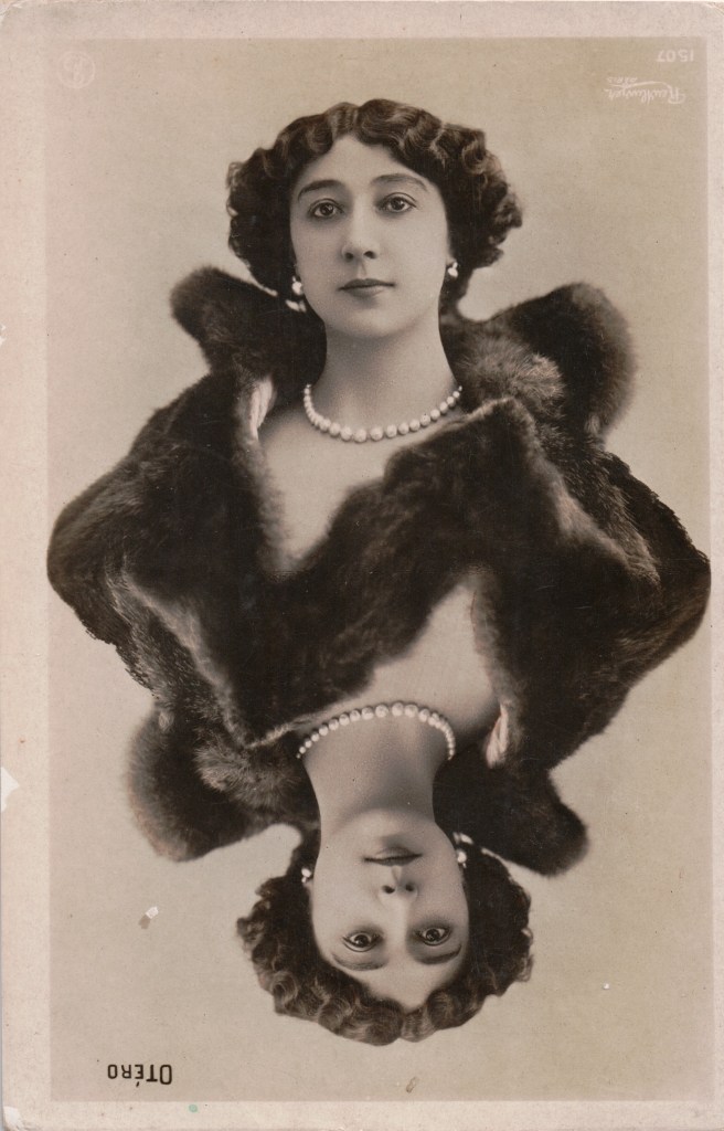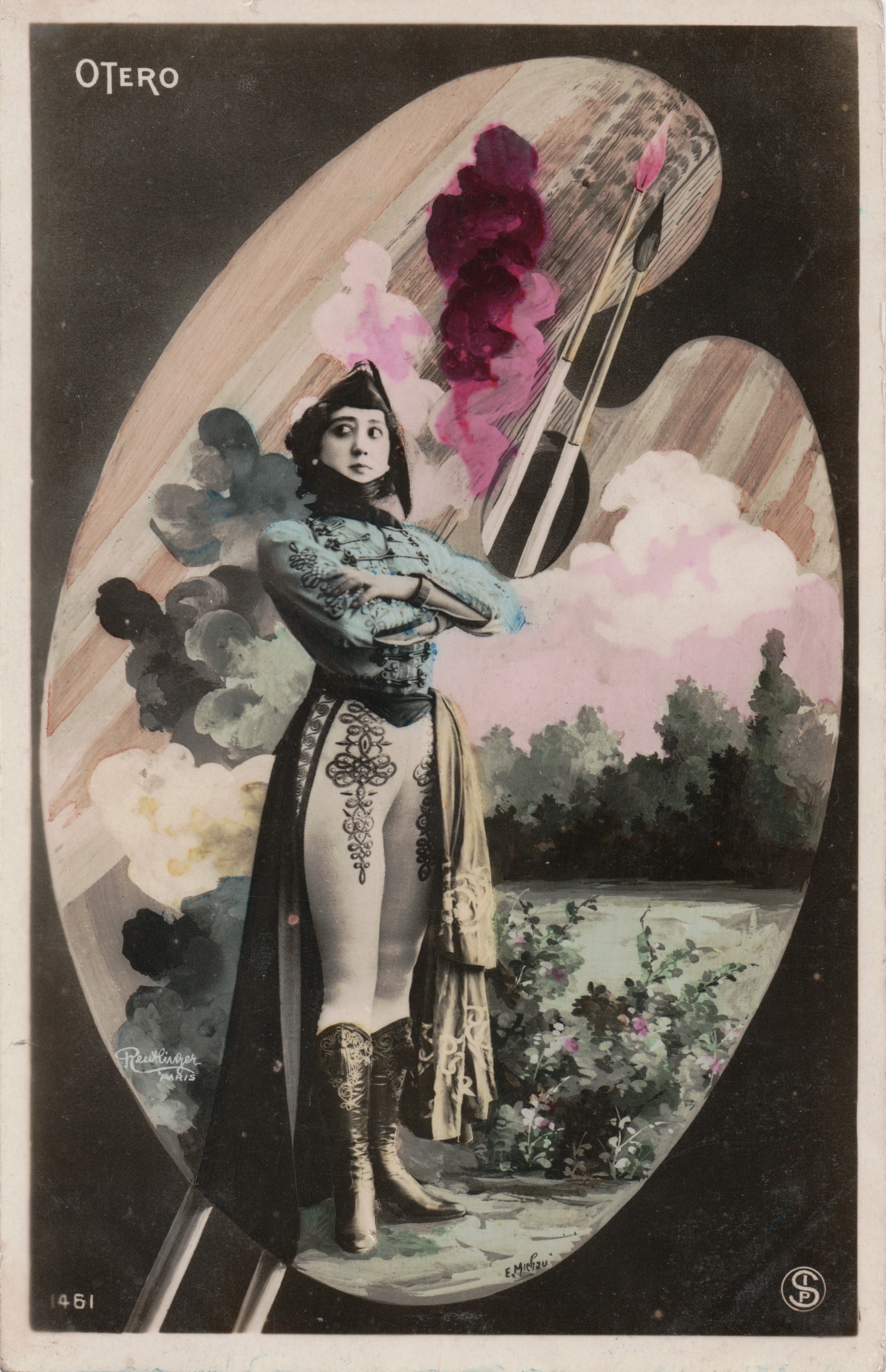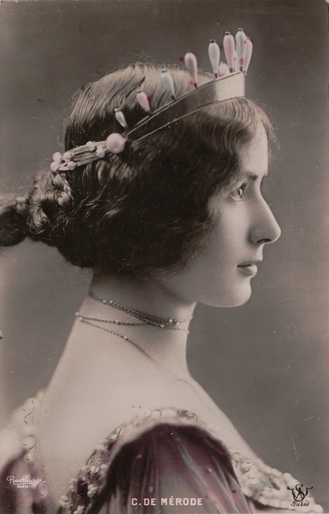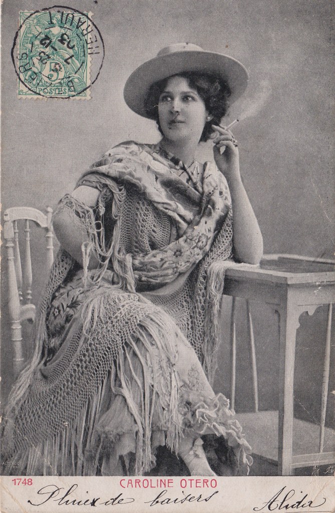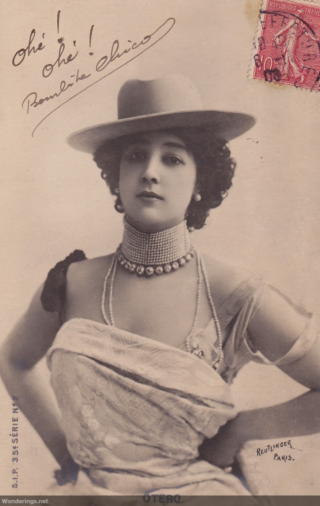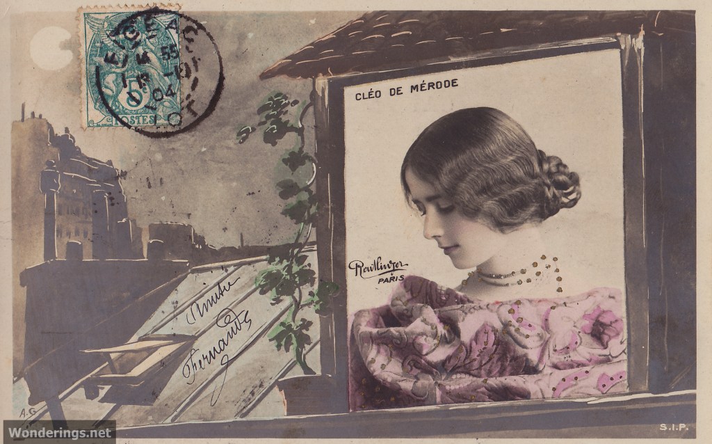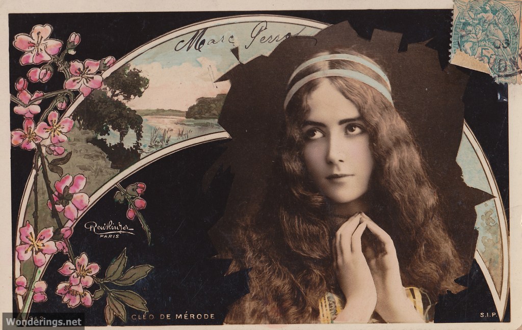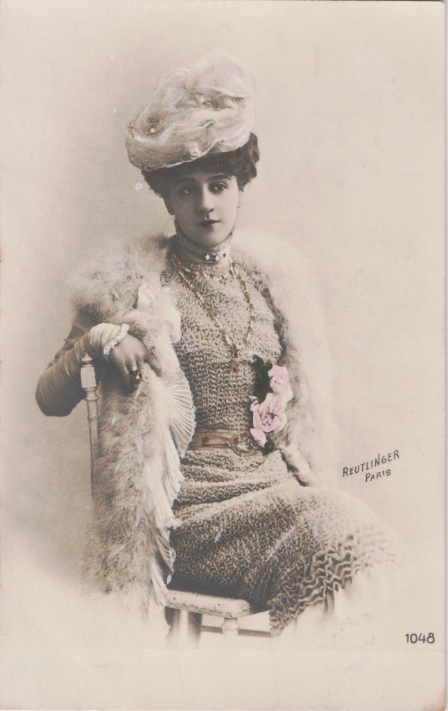 Cléo de Mérode, born in Paris, who was a famous ballet dancer, who also went on to dance at the the Folies Bergère. She has been called “the first modern icon.” Her wikipedia page and this Red List page has more information and images, but the definitive source for information about her life and significance is Carval’s book, referenced above. Here is an impressive online journal piece called “Cléo de Mérode’s Postcard Stardom.” This link appears to have film footage of her dancing (as well as Caroline Otero — see below).
