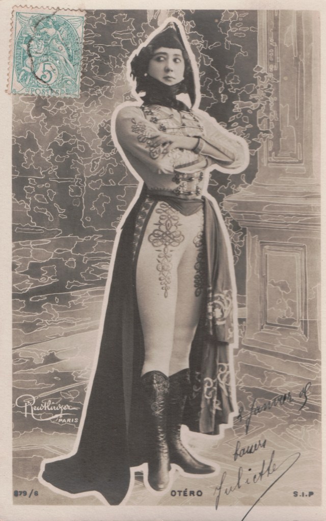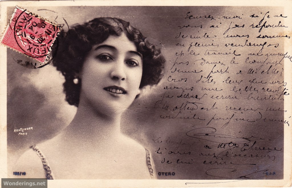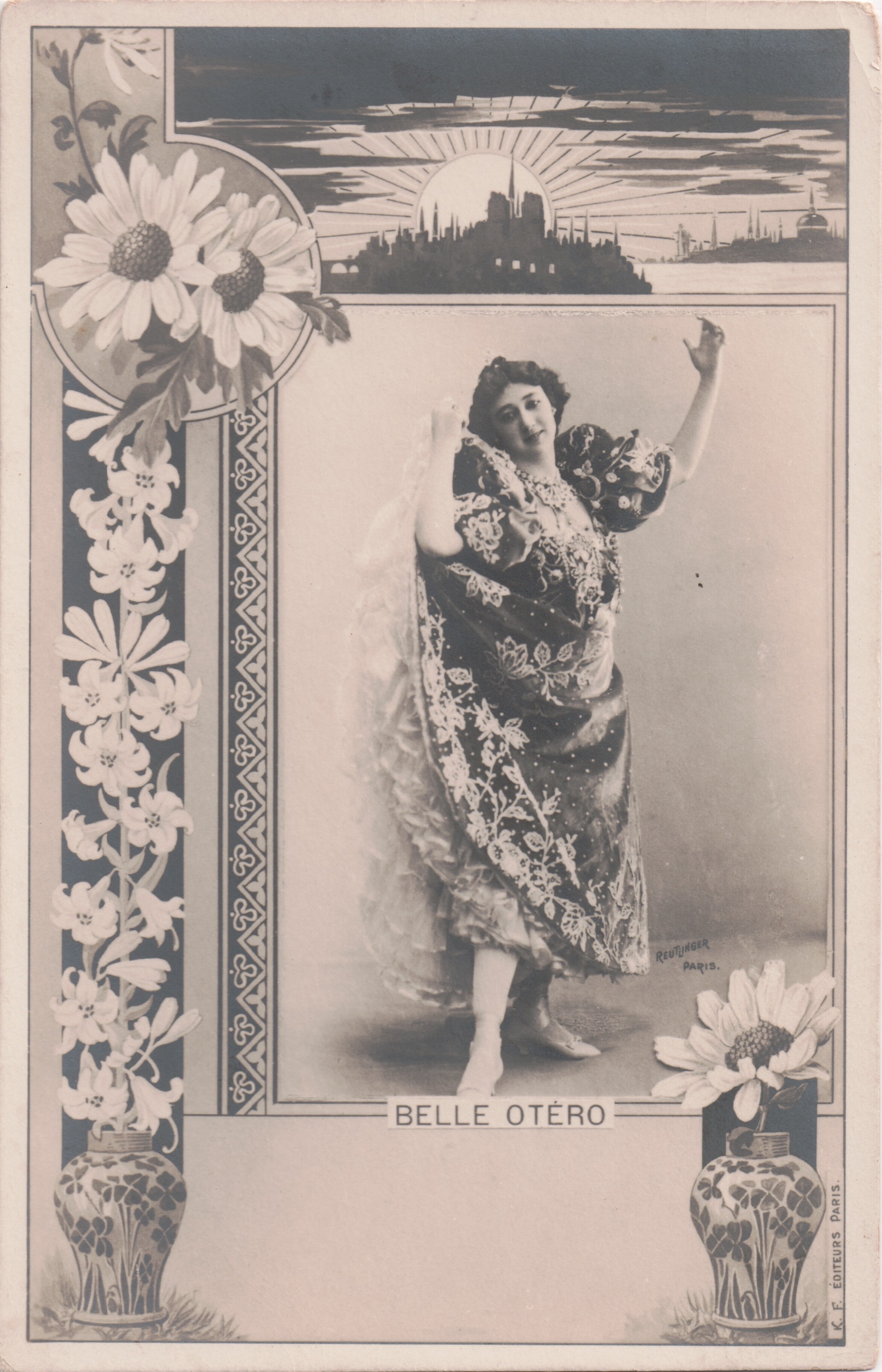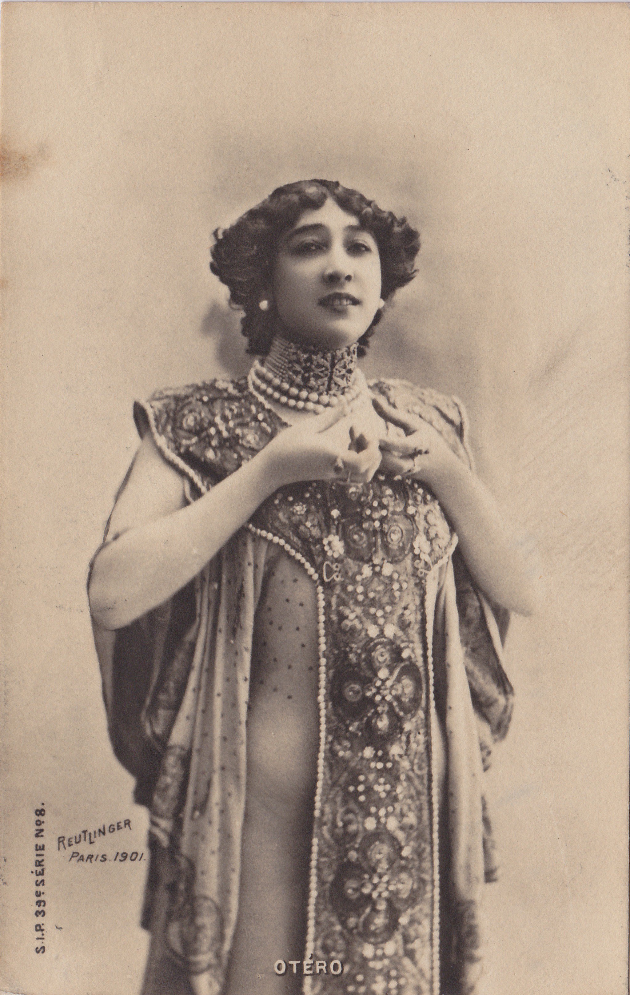 Carolina Otero (universally known as “La Belle Otéro”) is one of the most famous personalities featured on the Reutlinger postcards. Born in Galicia in 1868, there is a lot of information about her and more images on her Wikipedia page and this Red List page, and this link that has film footage of her dancing. This link appears to have a recording of her singing. It was once said of her that her extraordinarily dark black eyes were so captivating that they were “of such intensity that it was impossible not to be detained before them.” Here are a few cards from my collection featuring La Belle Otero: