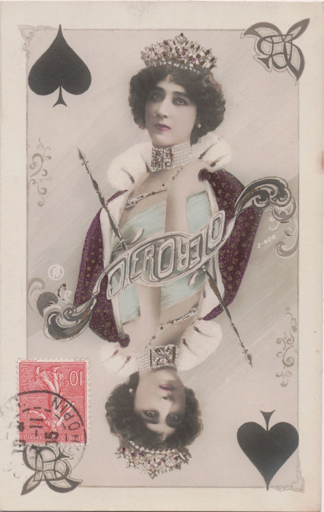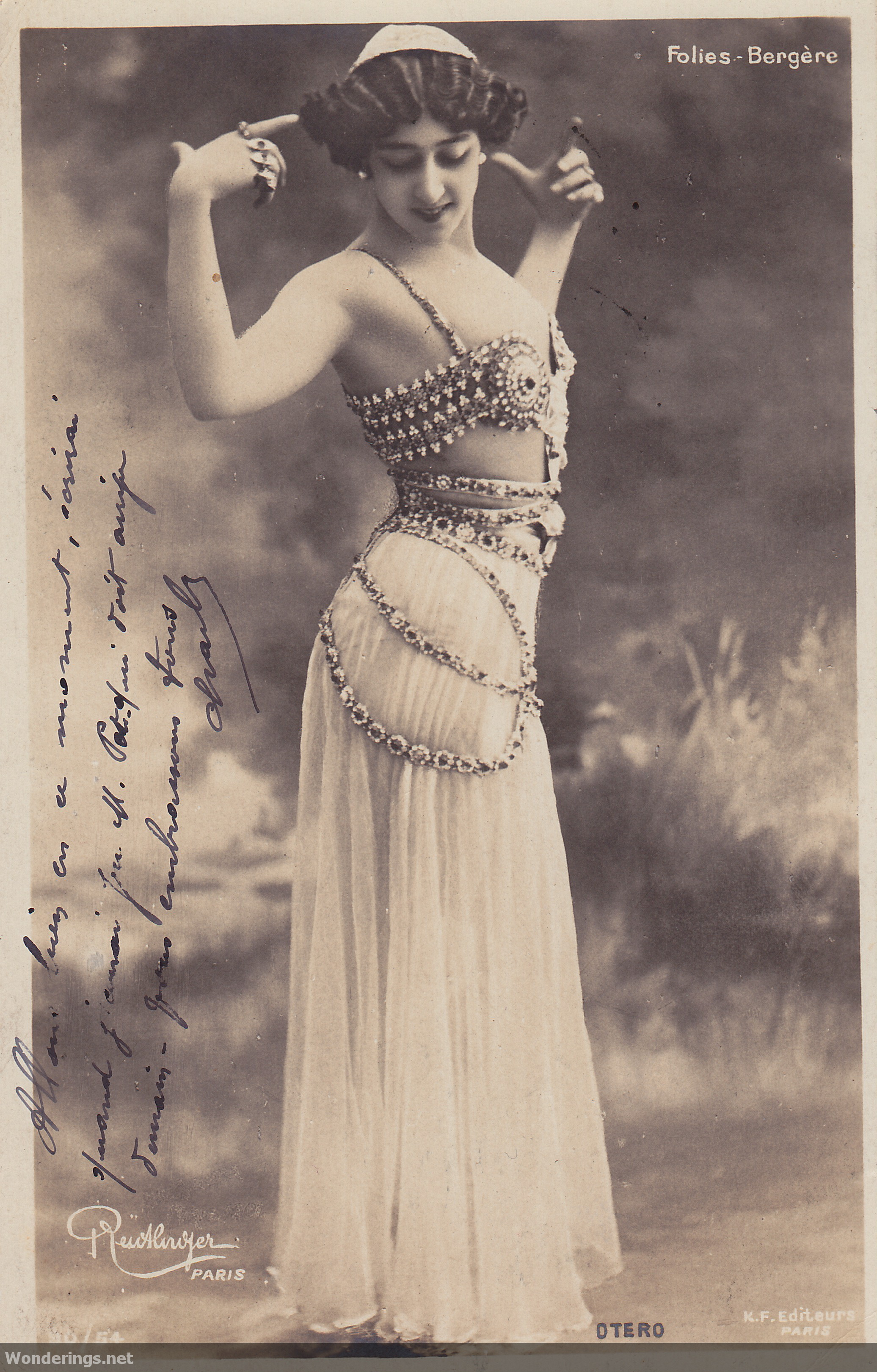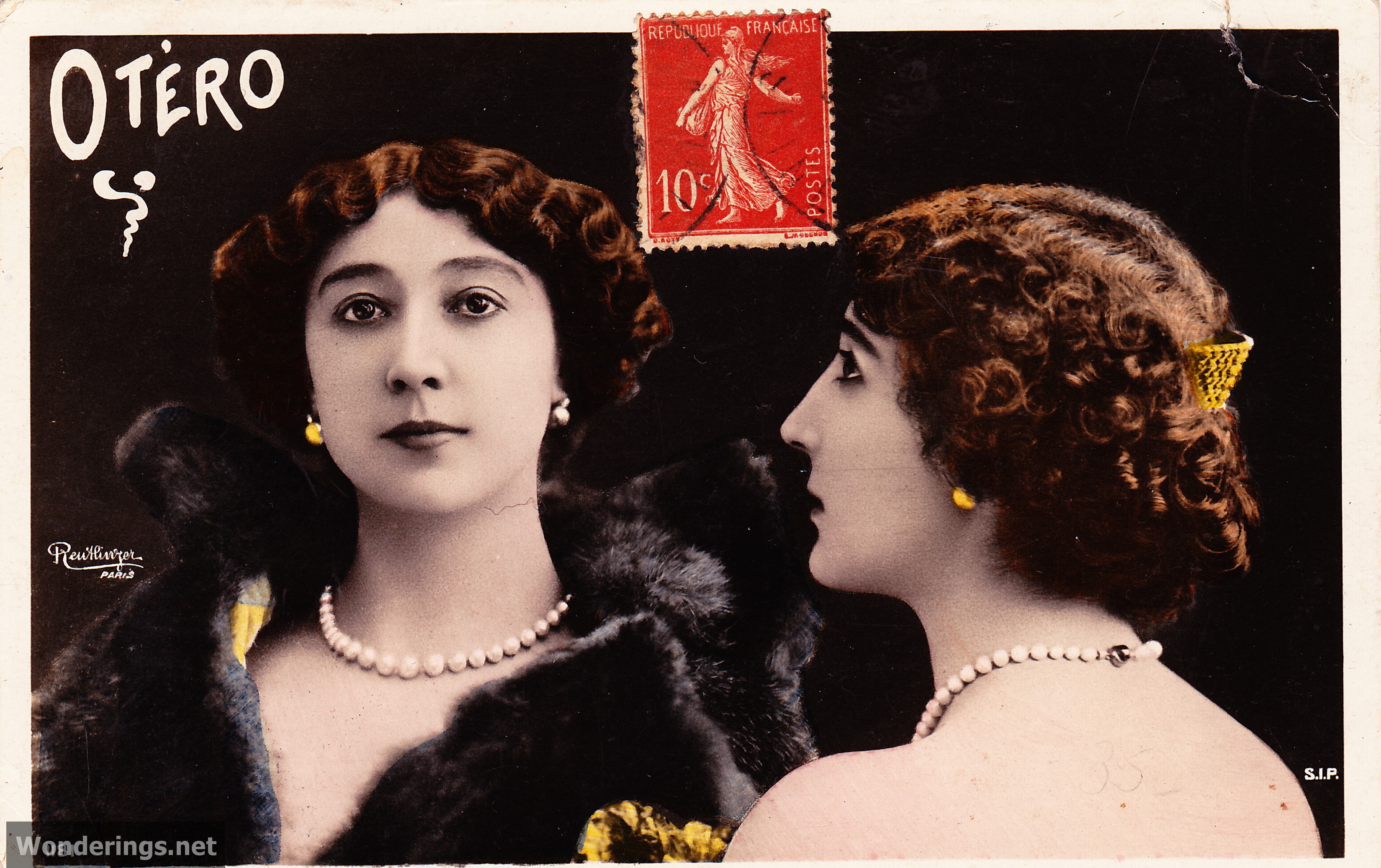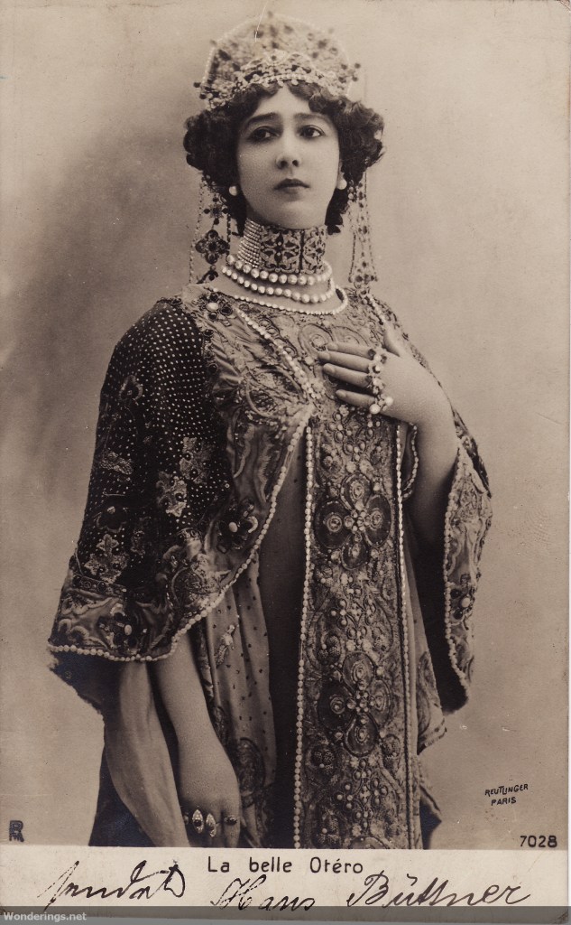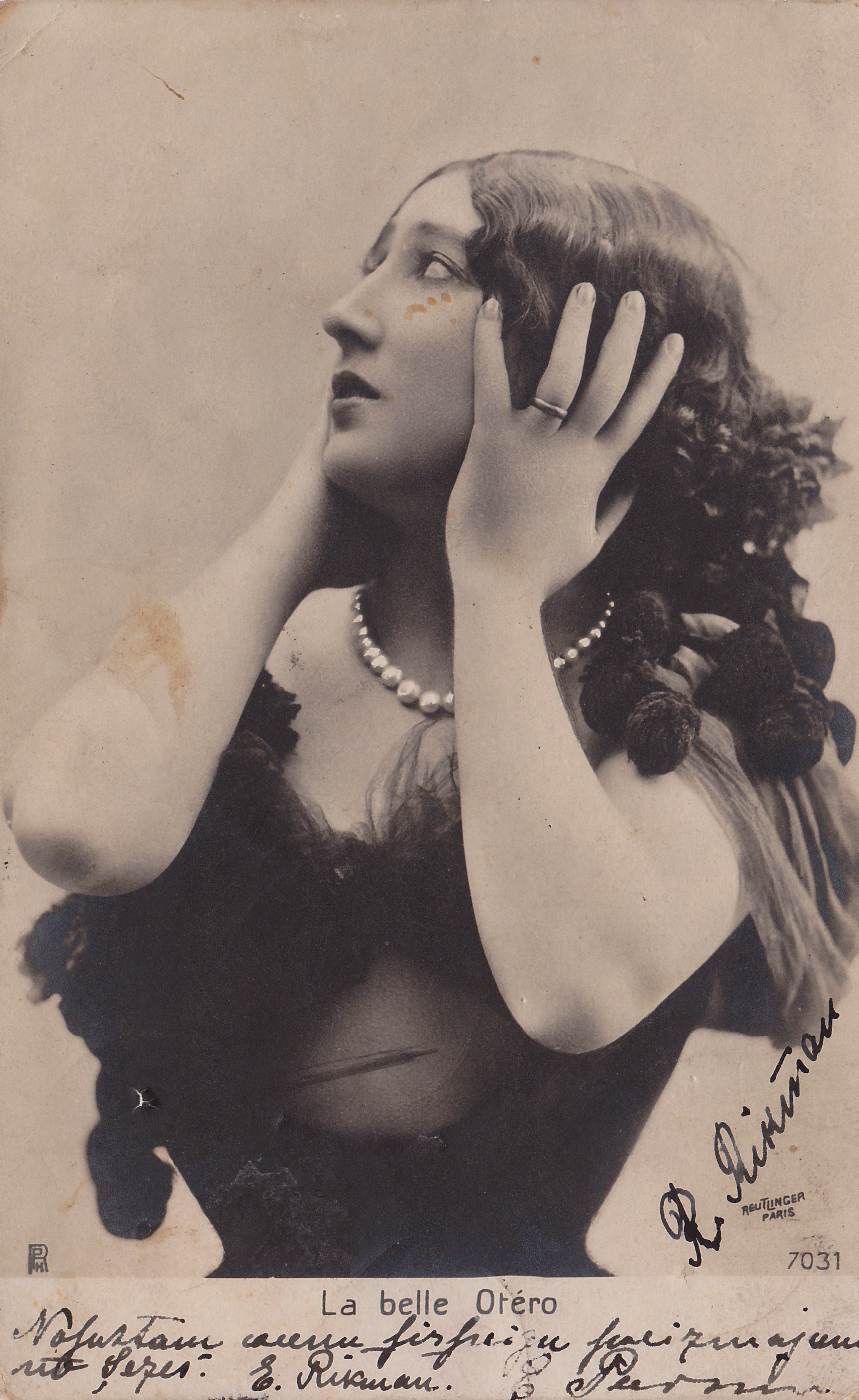 Carolina Otero (universally known as “La Belle Otéro”) is one of the most famous personalities featured on the Reutlinger postcards. Born in Galicia in 1868, there is a lot of information about her and more images on her Wikipedia page and this Red List page, and this link that has film footage of her dancing. This link appears to have a recording of her singing. It was once said of her that her extraordinarily dark black eyes were so captivating that they were “of such intensity that it was impossible not to be detained before them.” Here are a few cards from my collection featuring La Belle Otero:
