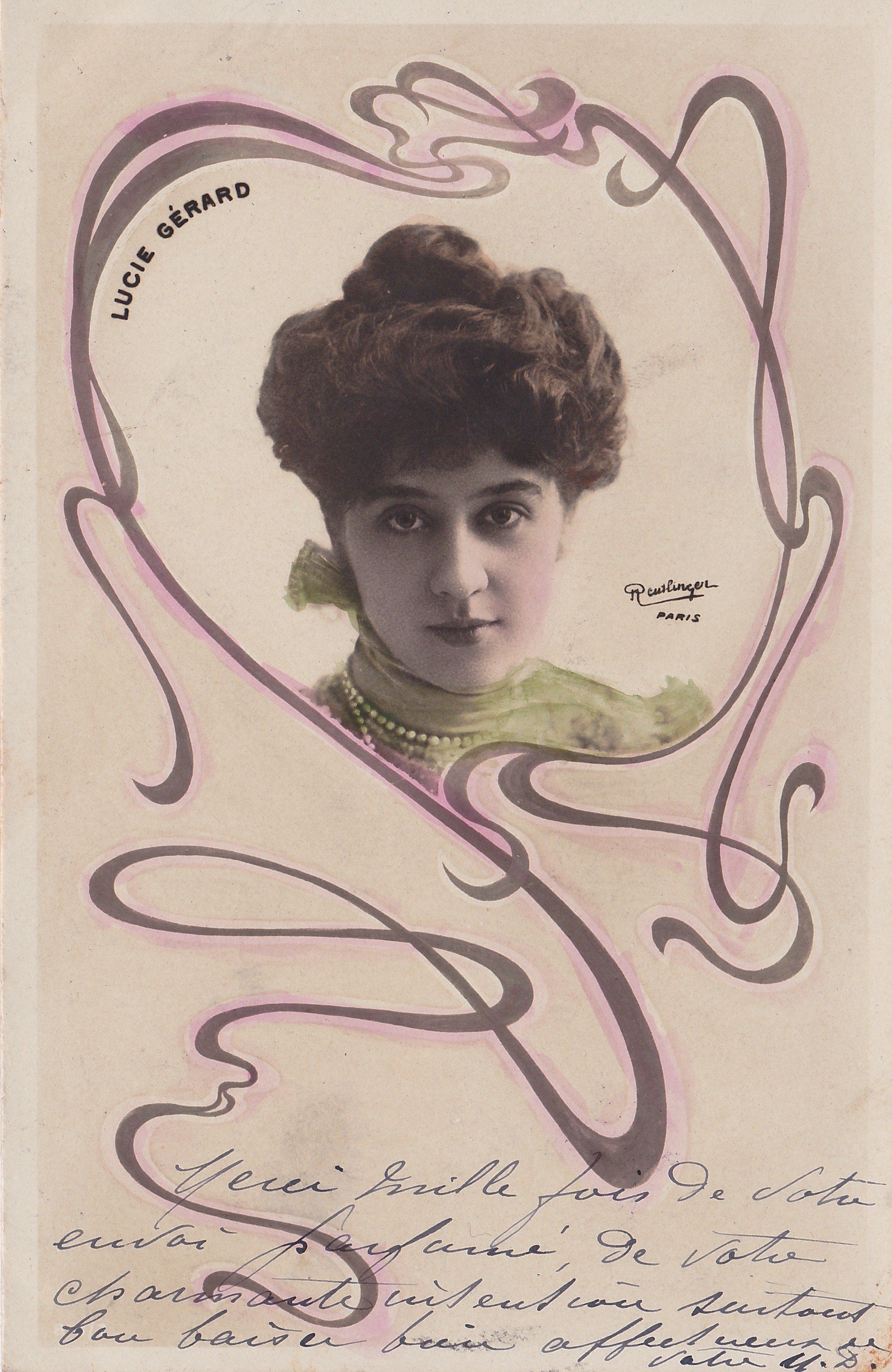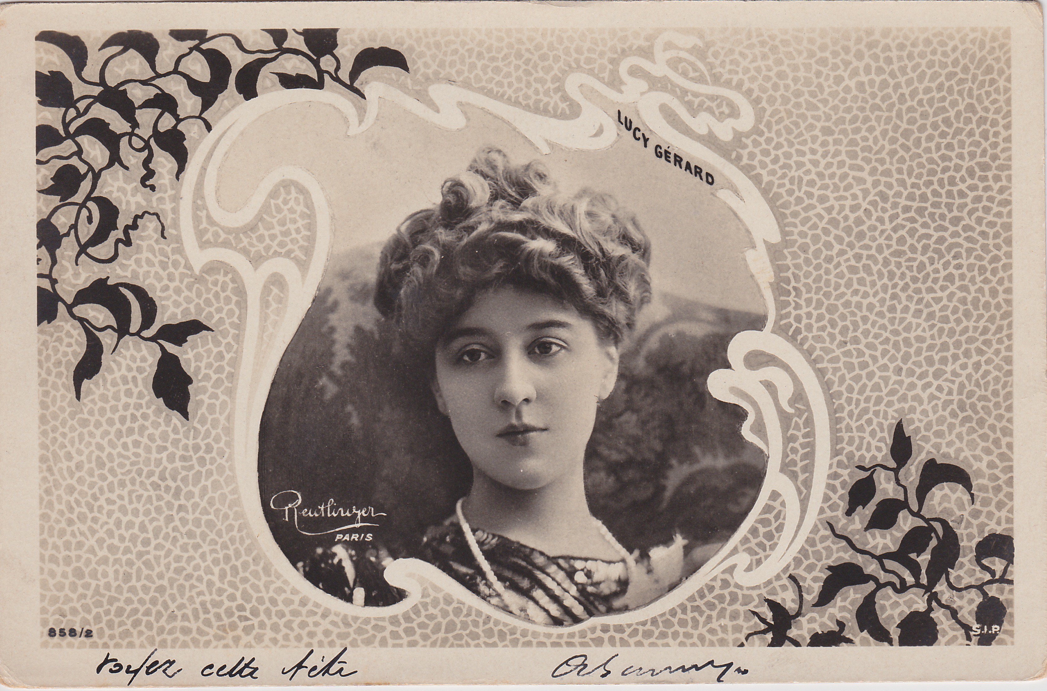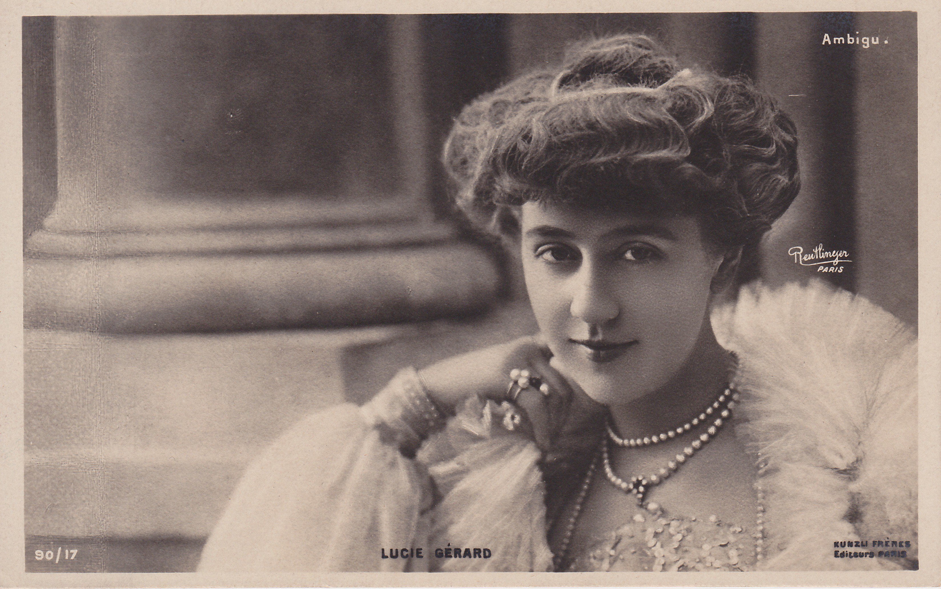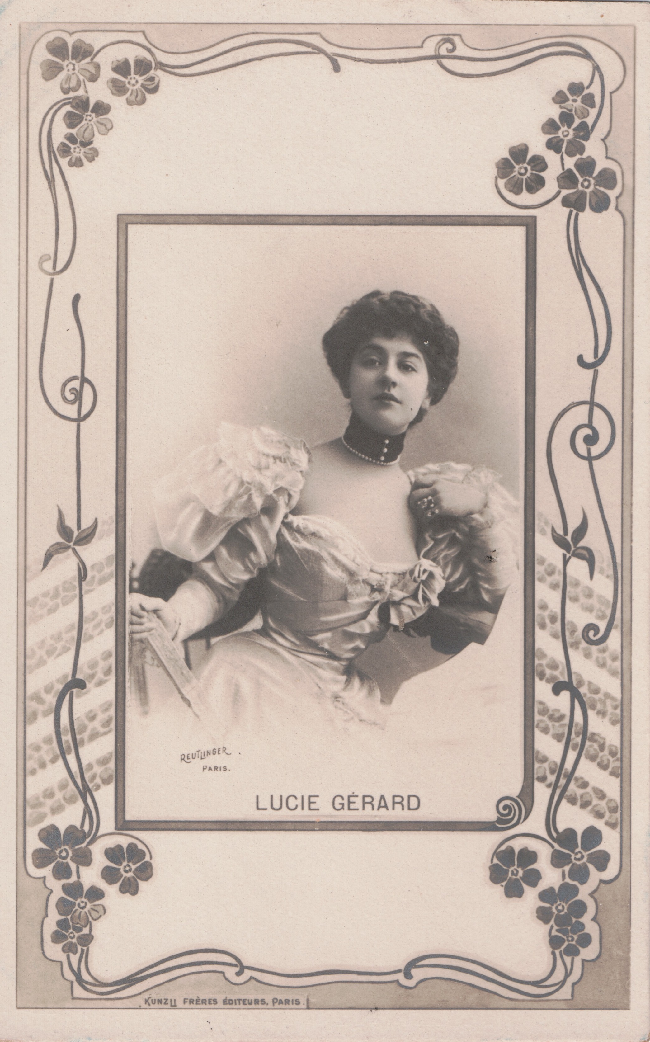 Lucie (or Lucy) Gerard was born in Lyon in 1872. According to her Wikipedia page, she was a stage actress and later appeared in silent films (billed as Lucy Mareil). There is also an informative entry on Gerard on the blog “Red Poulaine’s Musings.”