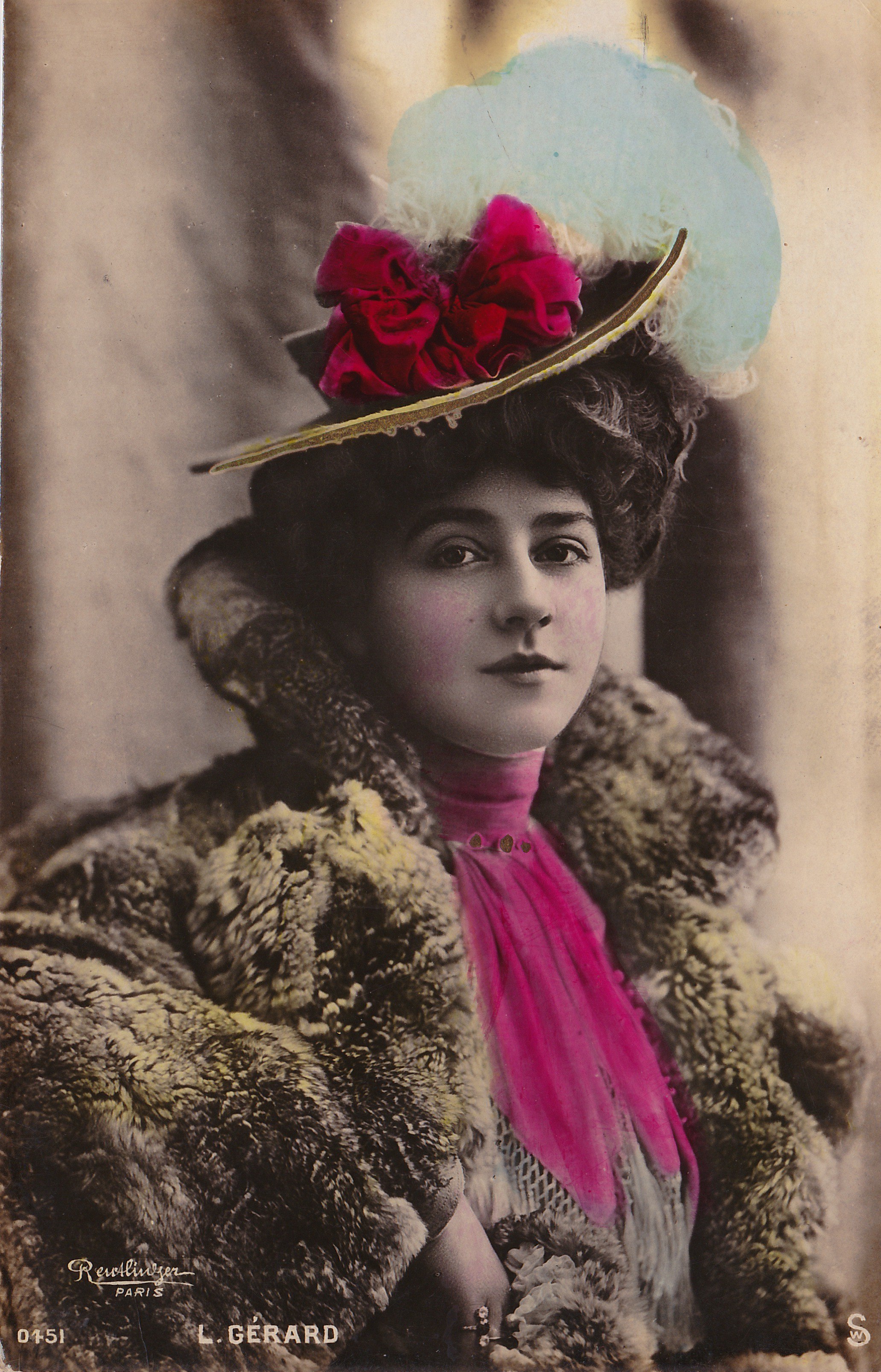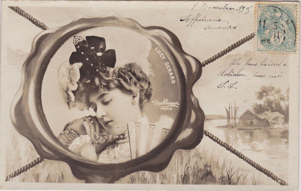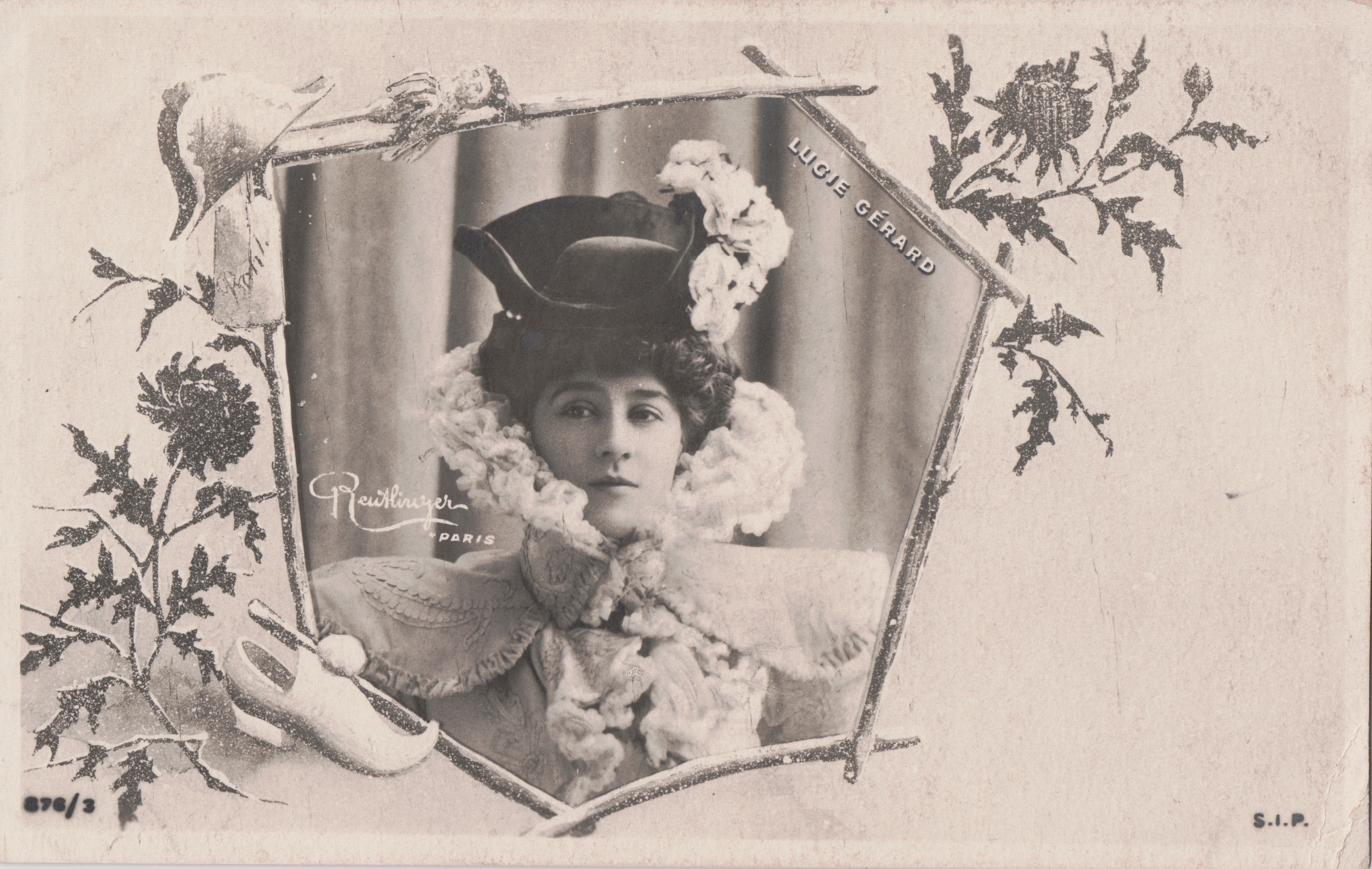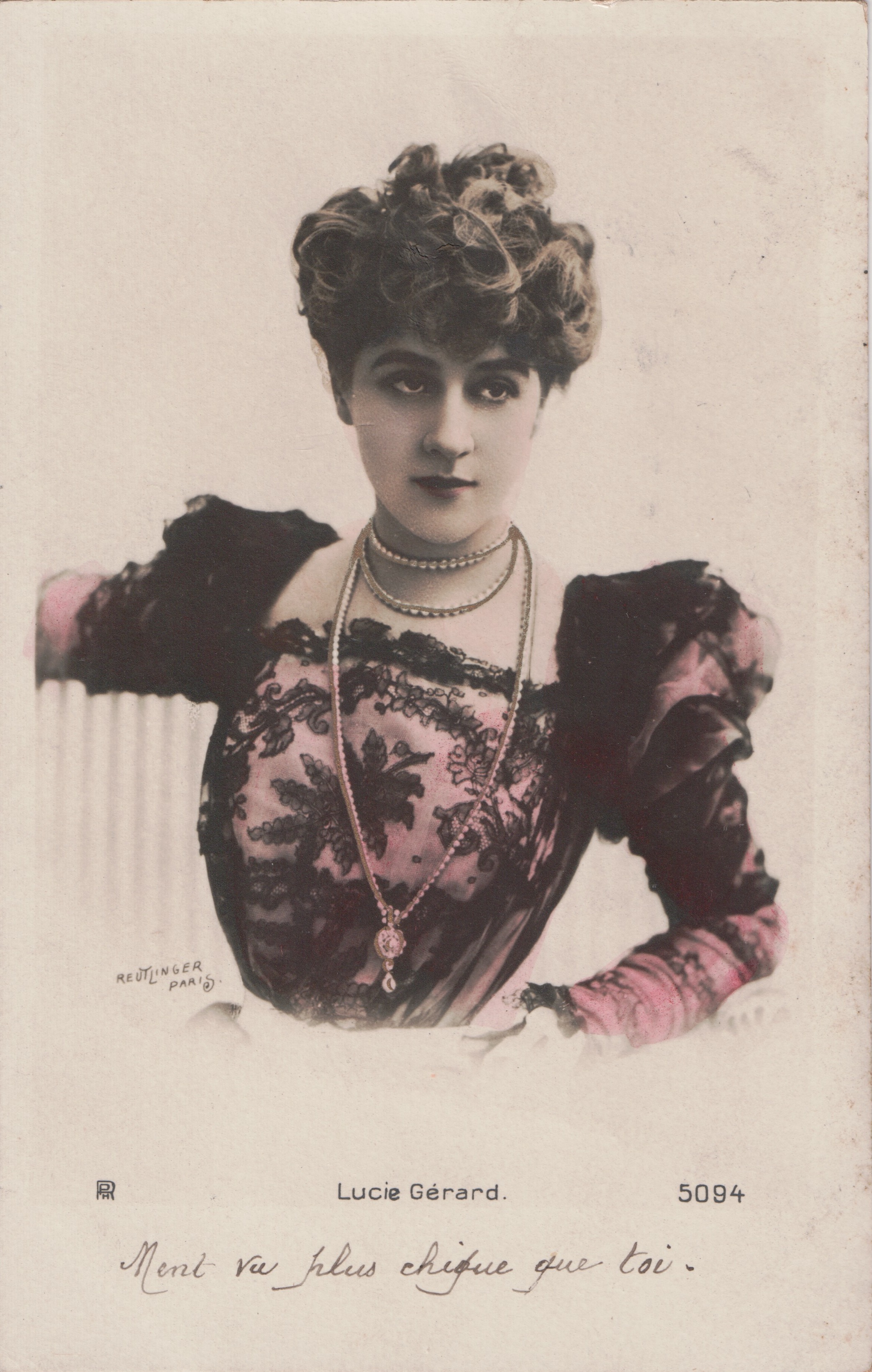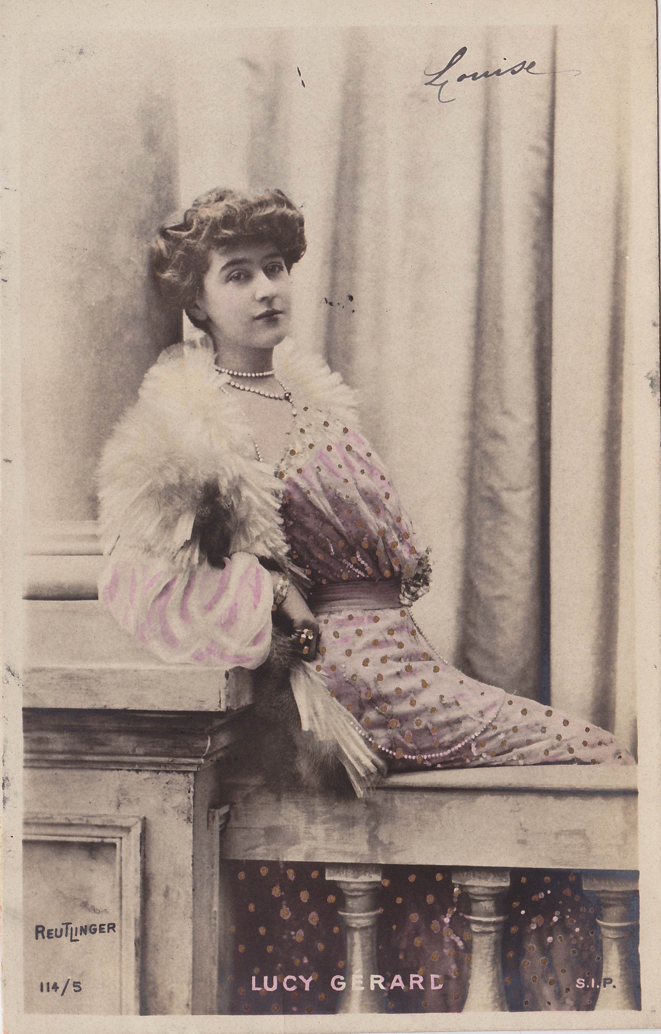 Lucie (or Lucy) Gerard was born in Lyon in 1872. According to her Wikipedia page, she was a stage actress and later appeared in silent films (billed as Lucy Mareil). There is also an informative entry on Gerard on the blog “Red Poulaine’s Musings.”
